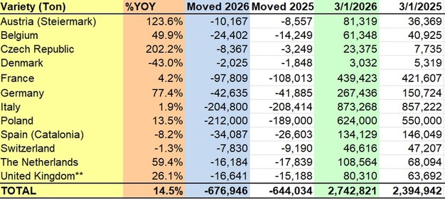 Les Pays-Bas atteignent 108 564 tonnes (68 094 tonnes en 2025), et la Belgique progresse également, passant de 40 925 à 61 348 tonnes. L'Autriche (région de Styrie) enregistre une hausse notable, de 36 369 à 81 319 tonnes, tout comme la République tchèque, qui passe de 7 735 à 23 375 tonnes.