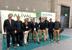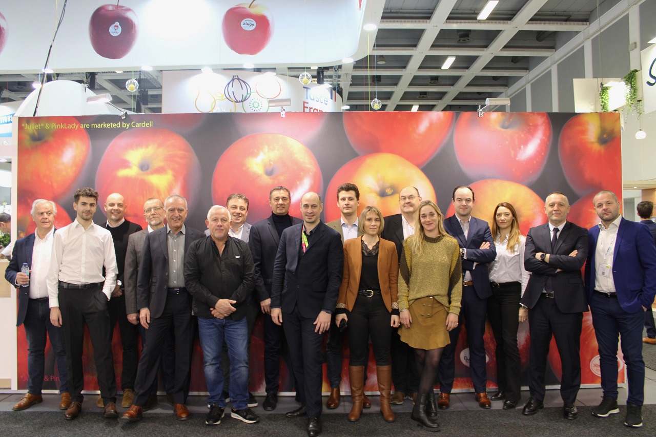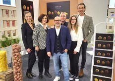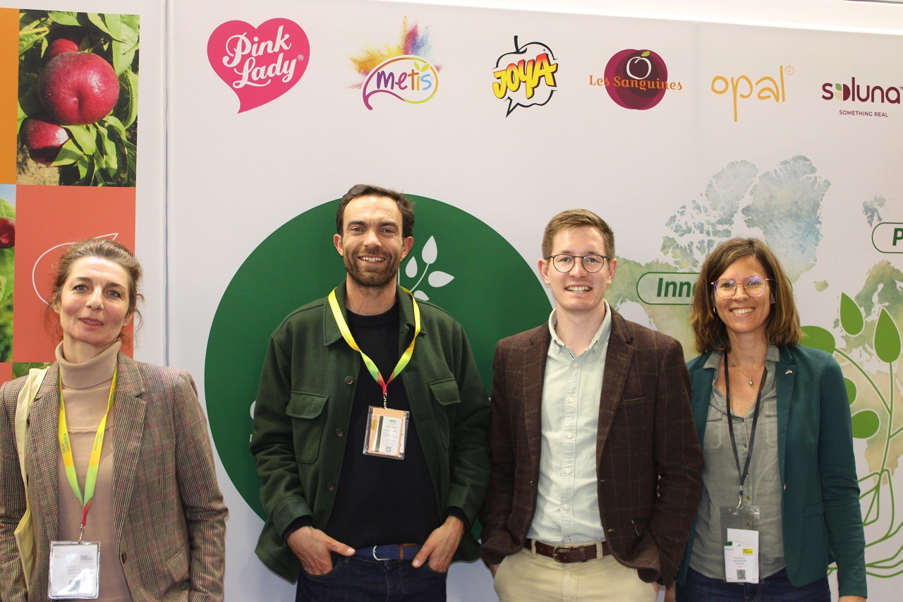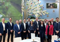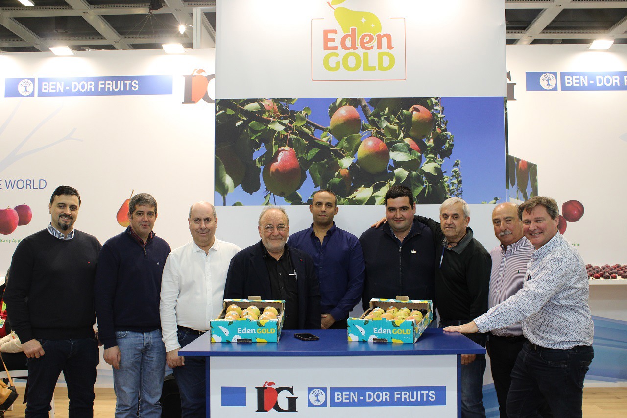 L'équipe d'Escande Nursery, de Ben Dor et de Timoteo sur le stand de Ben Dor pour présenter la nouvelle variété de poire Eden Gold