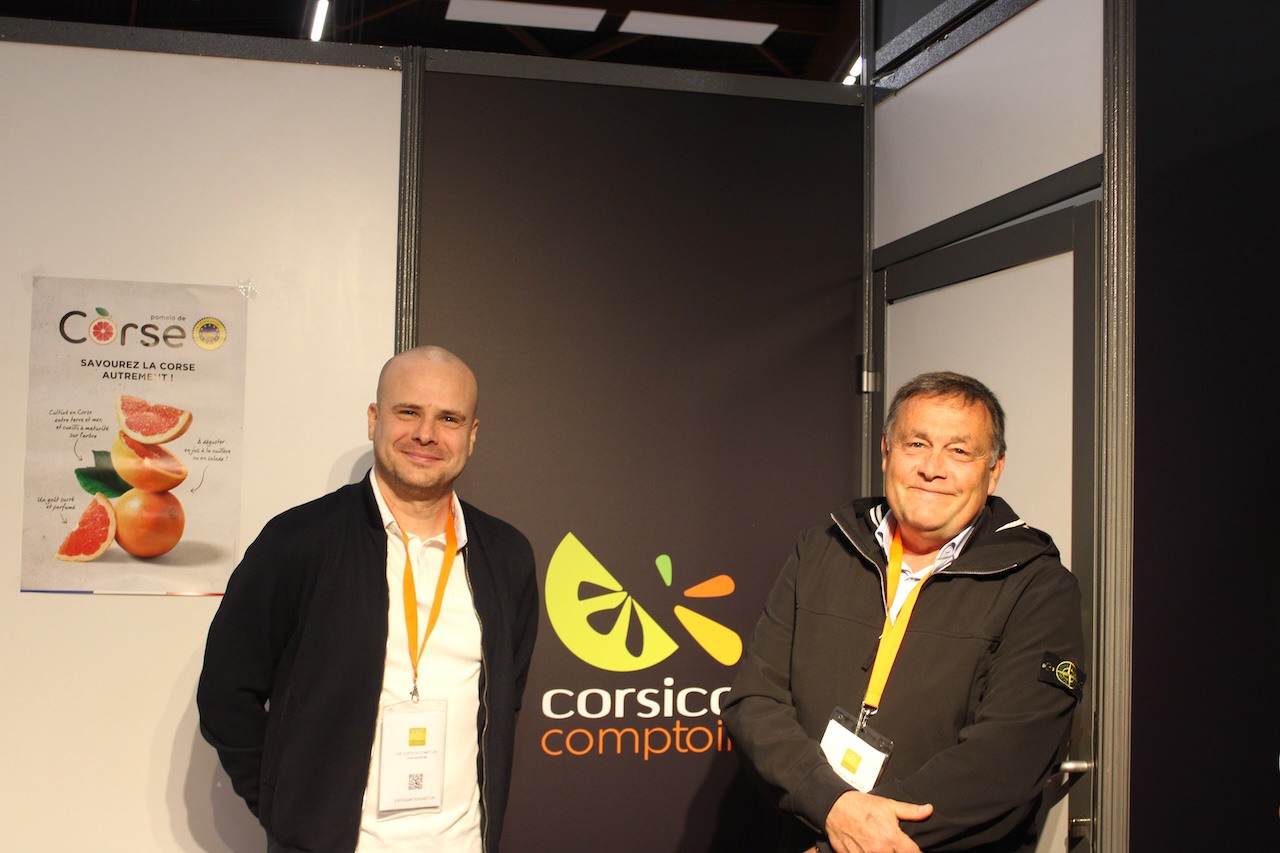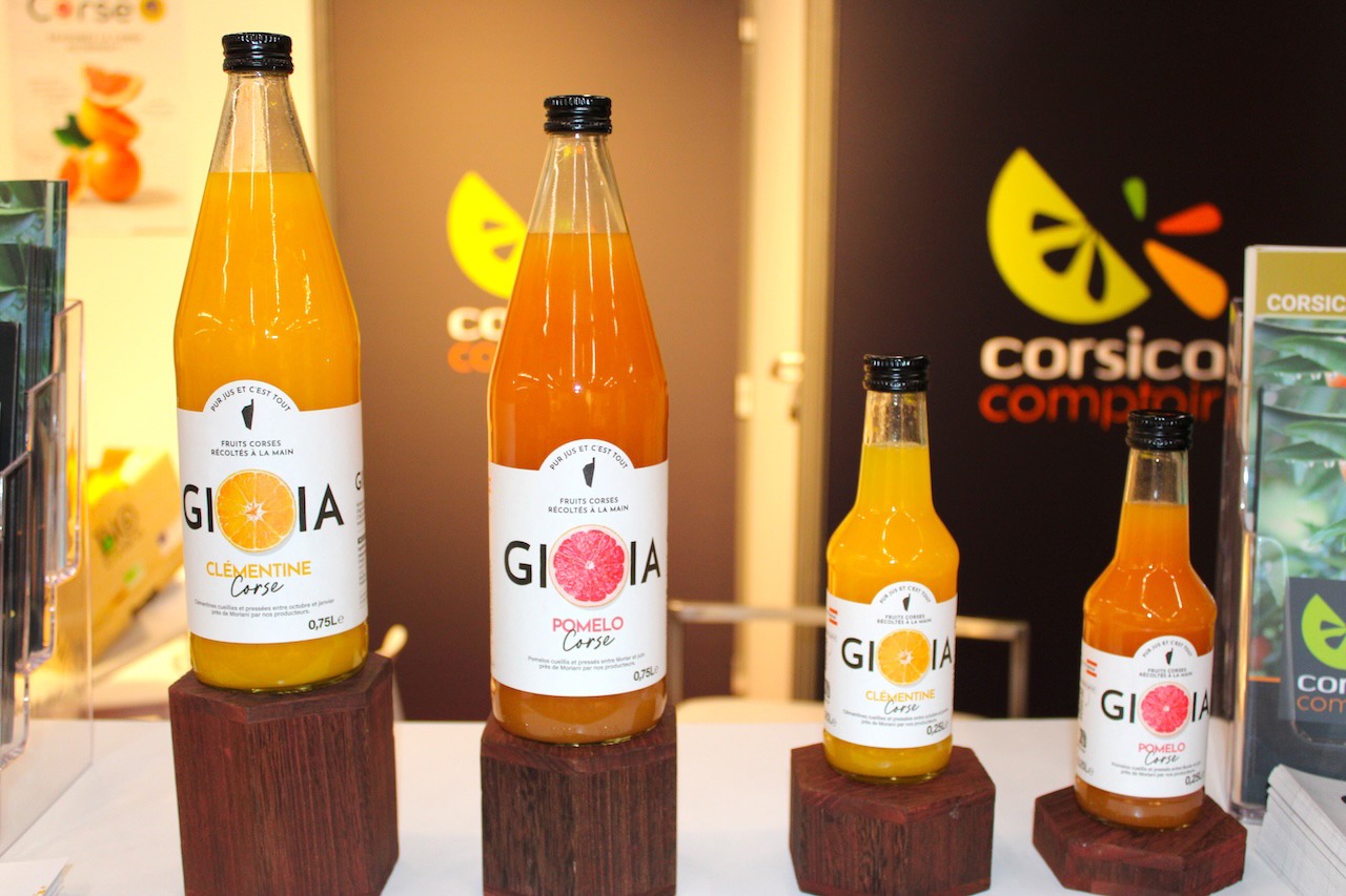 Corsica Comptoir, Groupement d'agriculteurs corses, avec Lucas Agostini et Pierre-Paul Monteil, venus présenter la gamme de jus de fruits pressés 'Gioia'  qui valorise les fruits déclassés