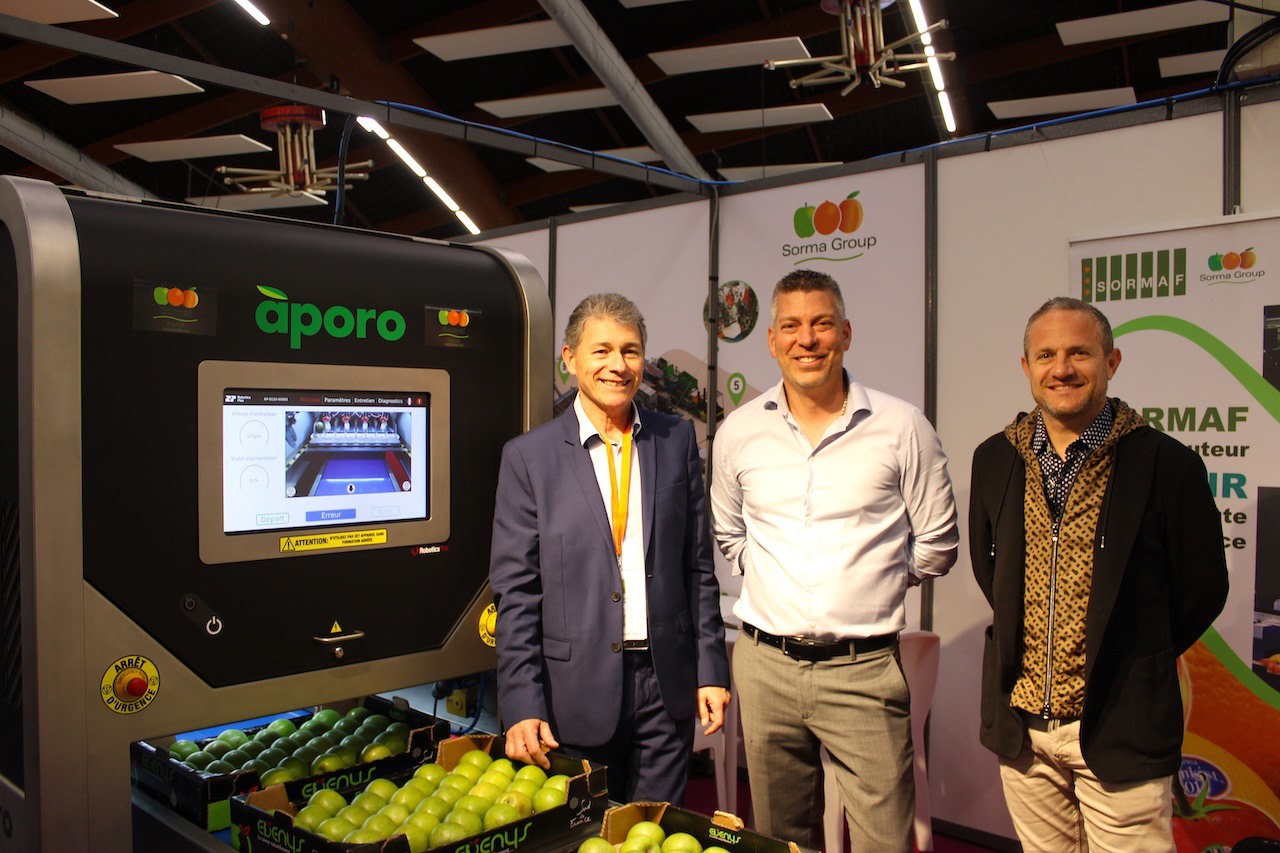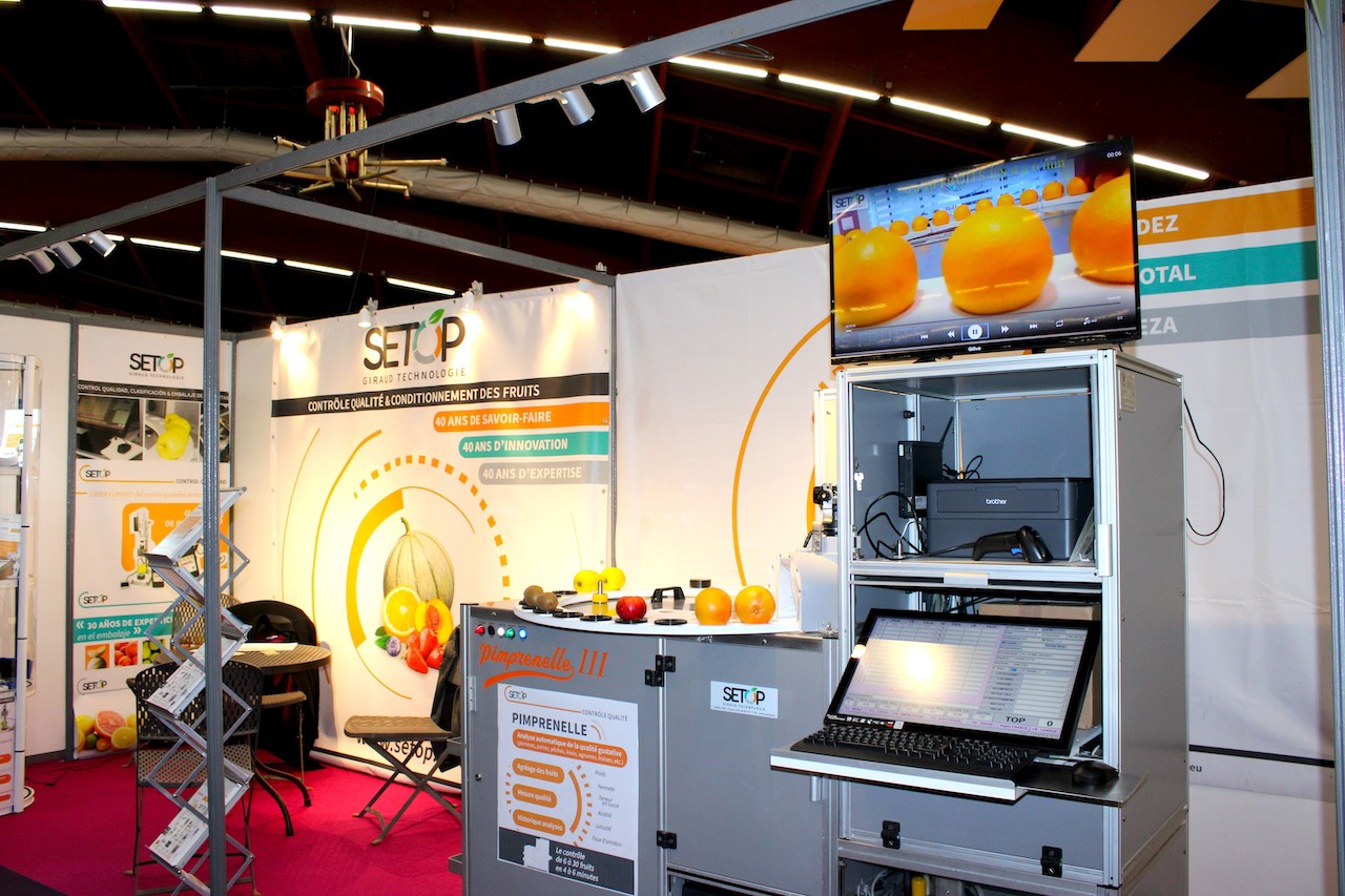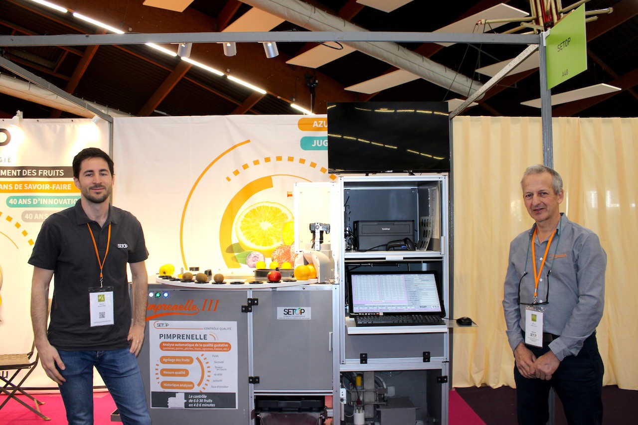 Setop et sa machine Pimprenelle III : laboratoire automatique d'agréage des fruits, qui mesure les poids, fermeté, teneur en sucres, acidité et jutosité d'un échantillon de 6 à 30 fruits