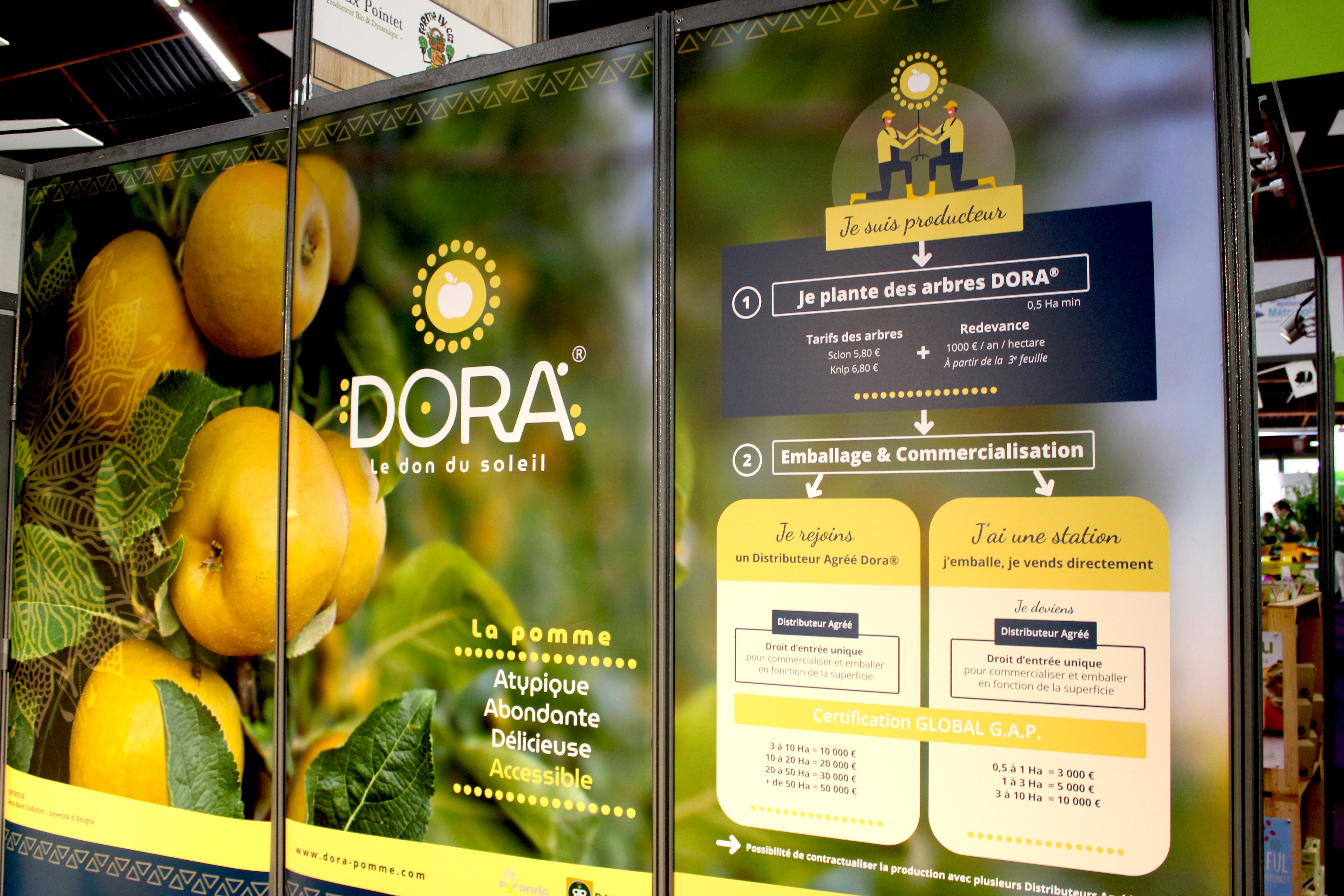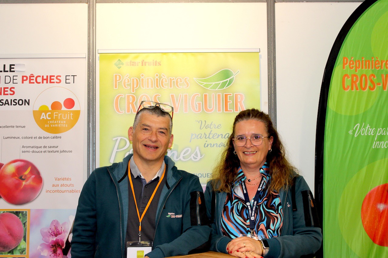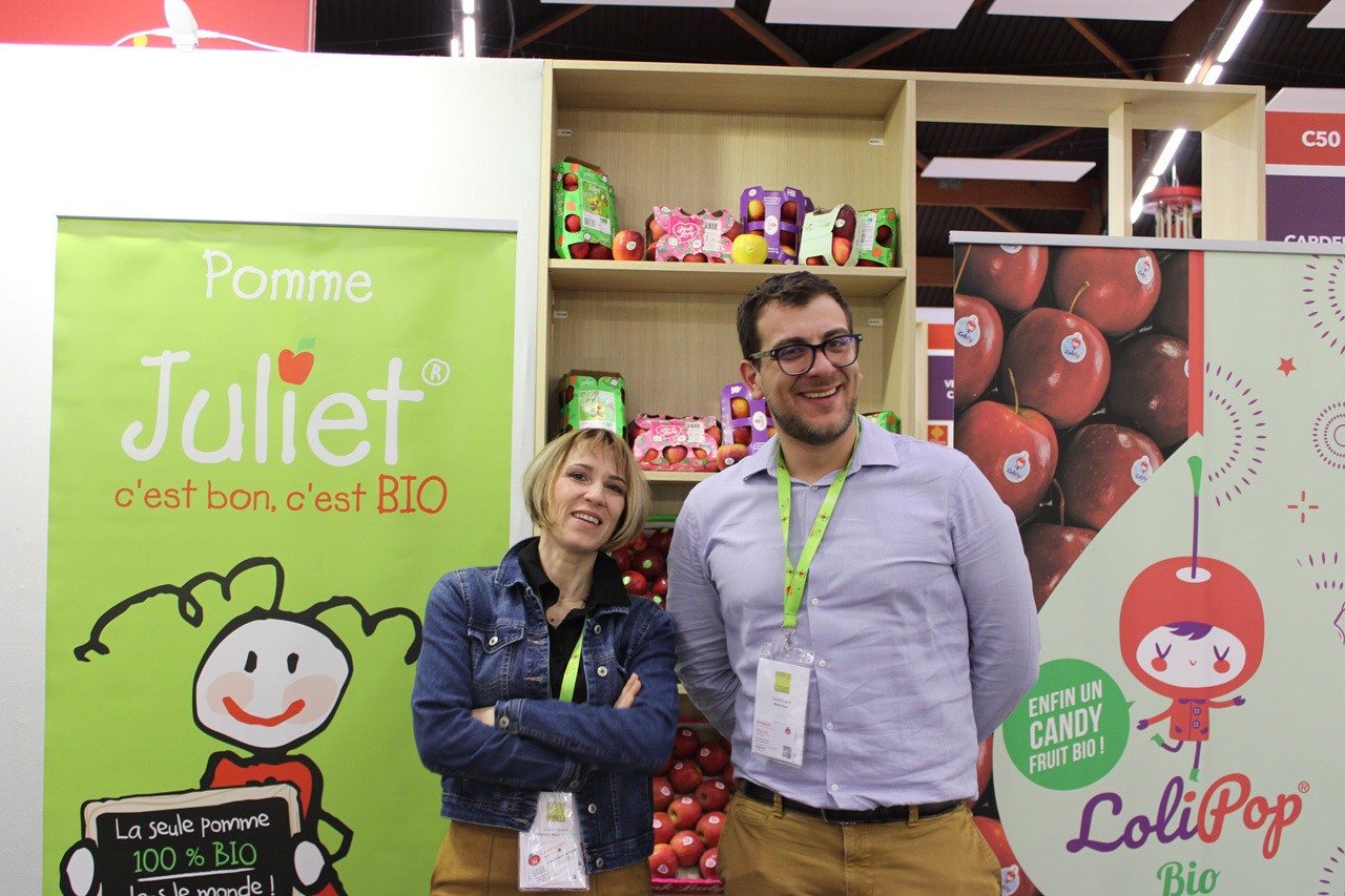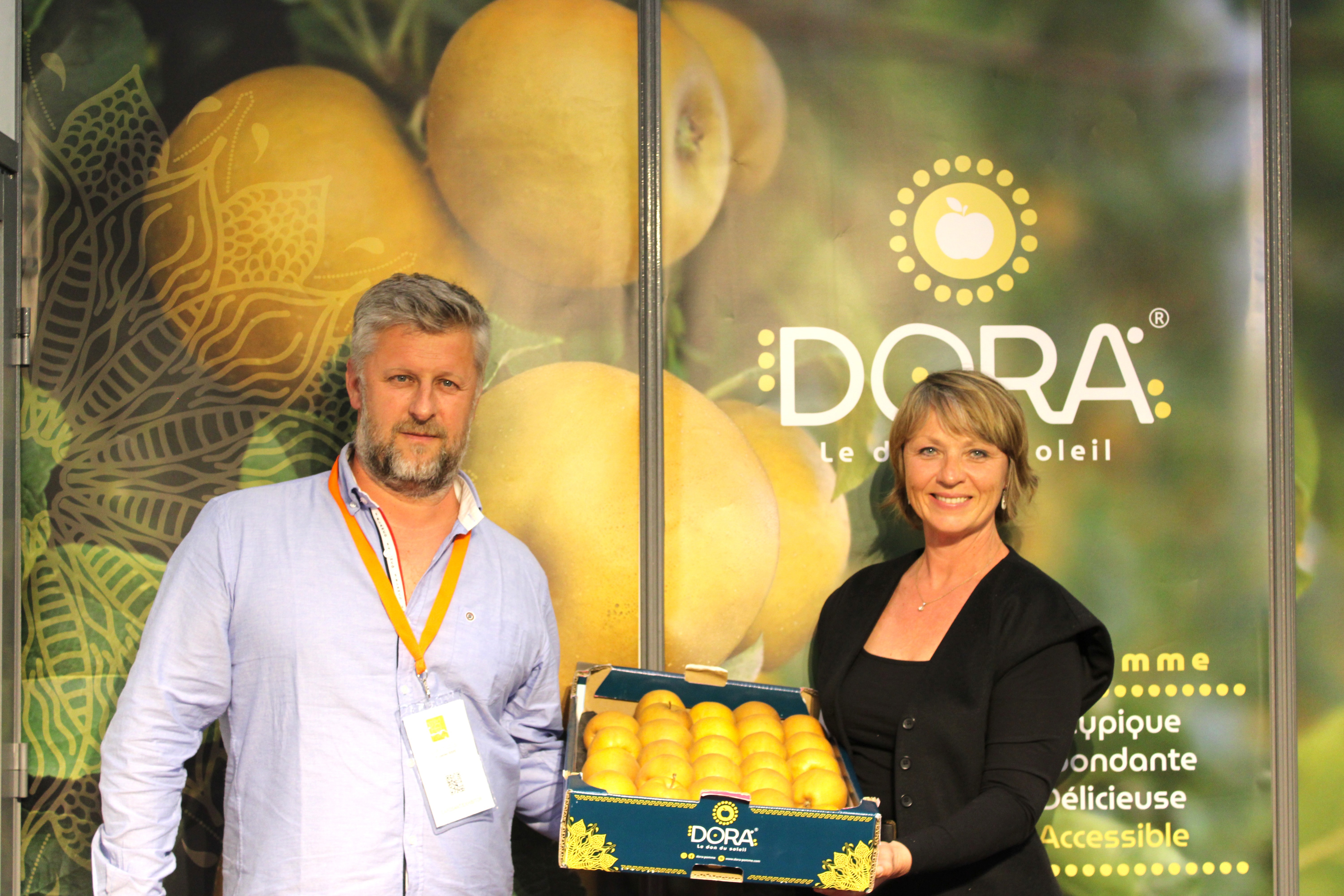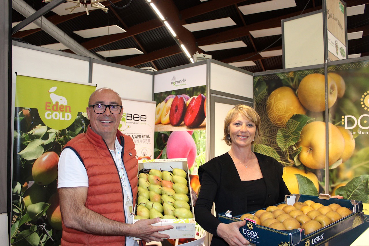 Frédéric Garcia et Monika Kujundzic présentant la poire Eden Gold et la nouvelle pomme Dora