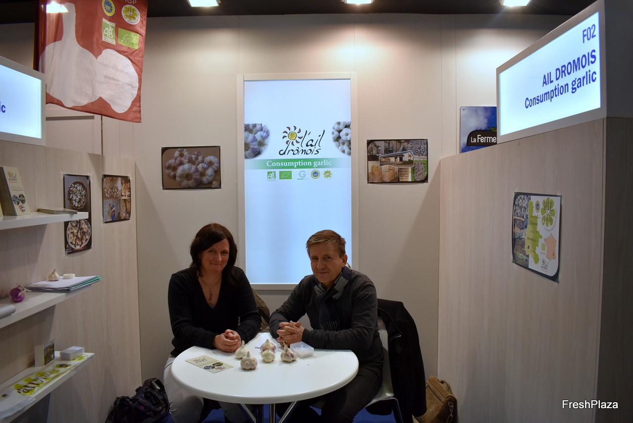 Aurélie Gasquet et André Piallat du GIE L'Ail Drômois présentant l'ail et l'échalote de consommation