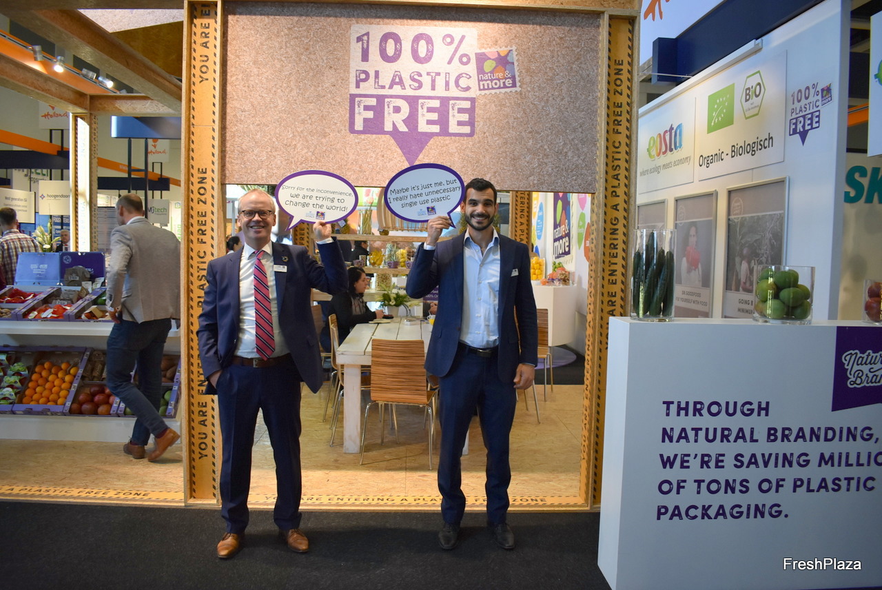 Michaël Wilde et Nicolas Coste de la société Eosta ont présenté une gamme de produits dépourvus d'emballages plastique