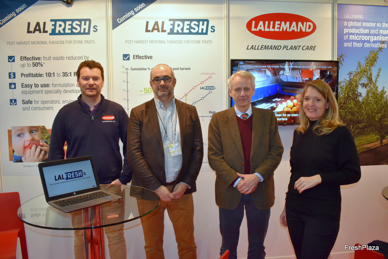 L'équipe de Lallemand Plant Care a présenté le nouveau traitement en post-récolte LALFRESHs pour les fruits à noyau. De gauche à droite : Julien Sindou (directeur marketing), Caroline de Rauglaudre (responsable communication), Matthieu Morel (directeur technique) et Frank Verber (Nantis)
