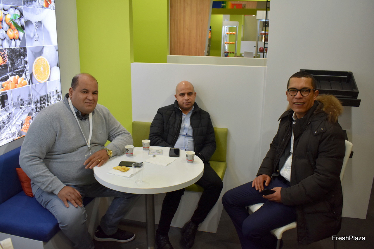 Awçalla Sidi Mohamed (Directeur général Attrans), Zakaria Adnan et Haj Mouhssin El Hallaoui (directeur station d'emballage des domaines El Hallaoui) sur le stand de Clementina