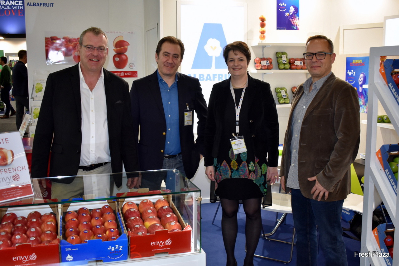 L'équipe d'Albafruit a présenté ses différentes pommes. De gauche a droite : Christophe Ochs, Éric Ségur, Dominique Monfraix et Laurent Martinet