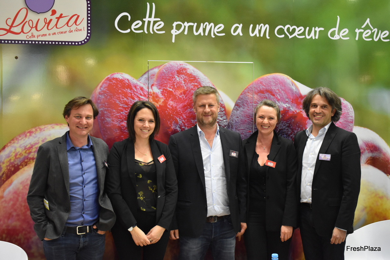 L'équipe de Lovita, une nouvelle variété de prune tardive : Benoît Escande (Escande Plants), Julie Rispe, Sébastien Guy, Monika Kujundzic et Sébastien Rispe
