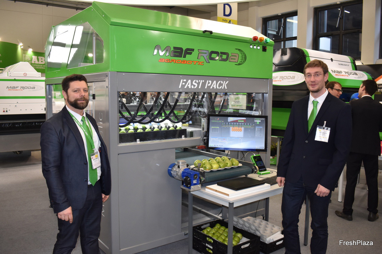 Christophe Nivet et Axel Habeillon de MAF RODA à côté du Fast Pack, une nouvelle machine pour la disposition des pommes