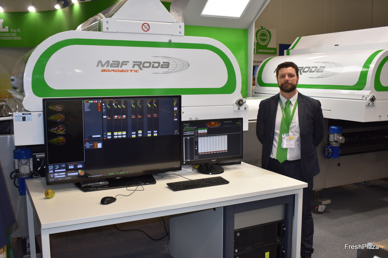 Christophe Nivet de MAF RODA à côté du Bi-Axone, une toute nouvelle calibreuse innovante pour les poires longues. La machine permet de tourner les poires délicatement sans les endommager.