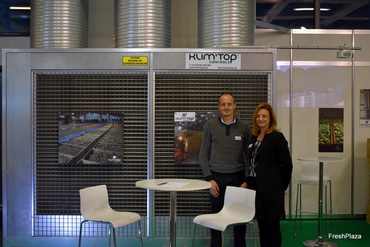 Eric Colpaert et Valérie Autem de Klim'Top ont présenté une machine de refroidissement pour le stockage des pommes de terre, choux et carottes. La machine aspire l'air chaud et le refroidit.