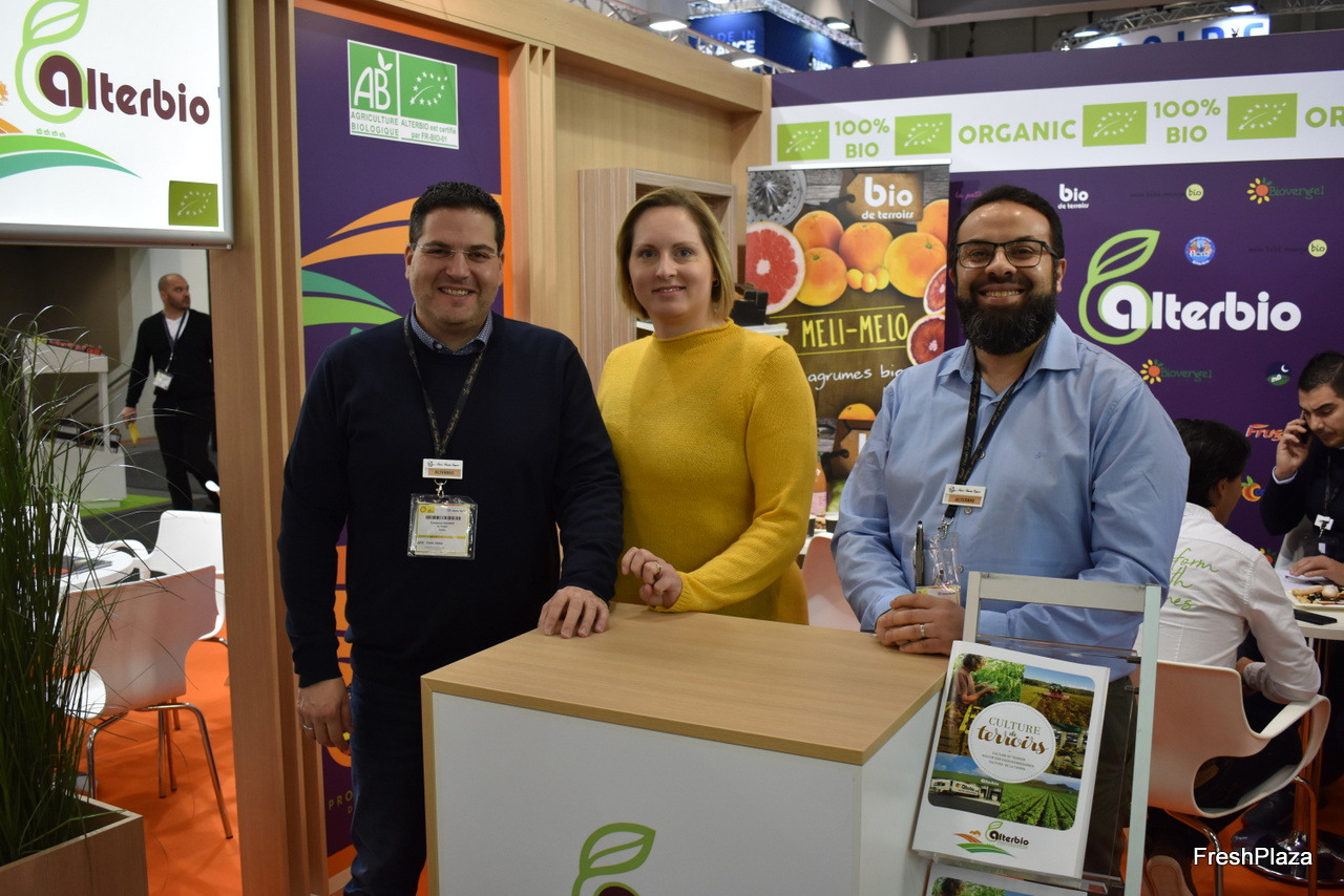 Houda Tonniche Ep. Khadhri, Khabbeb Khadhri du Groupement Interprofessionnel des Légumes et leur équipe ont présenté leur gamme de fruits et légumes et ont communiqué à l'occasion du salon sur le projet TIT Bio (production biologique en Tunisie)