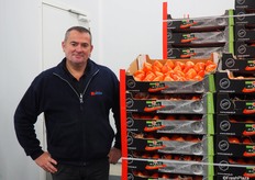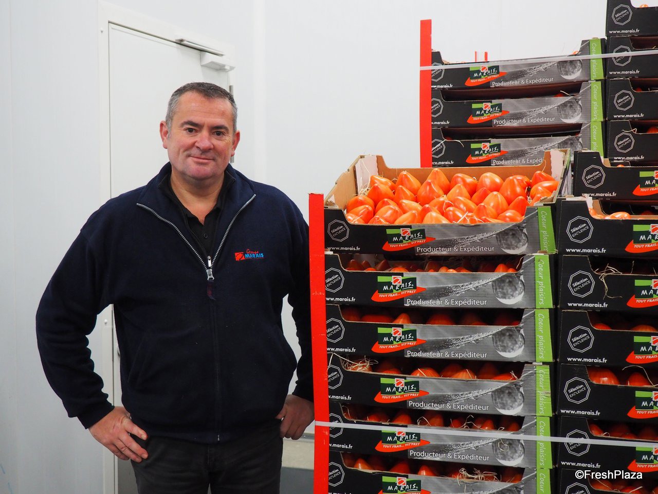 Mr Henry, directeur de la société Marais au MIN de Nantes, à côté de tomates coeur de boeuf de la marque Marais, produites dans la région nantaise