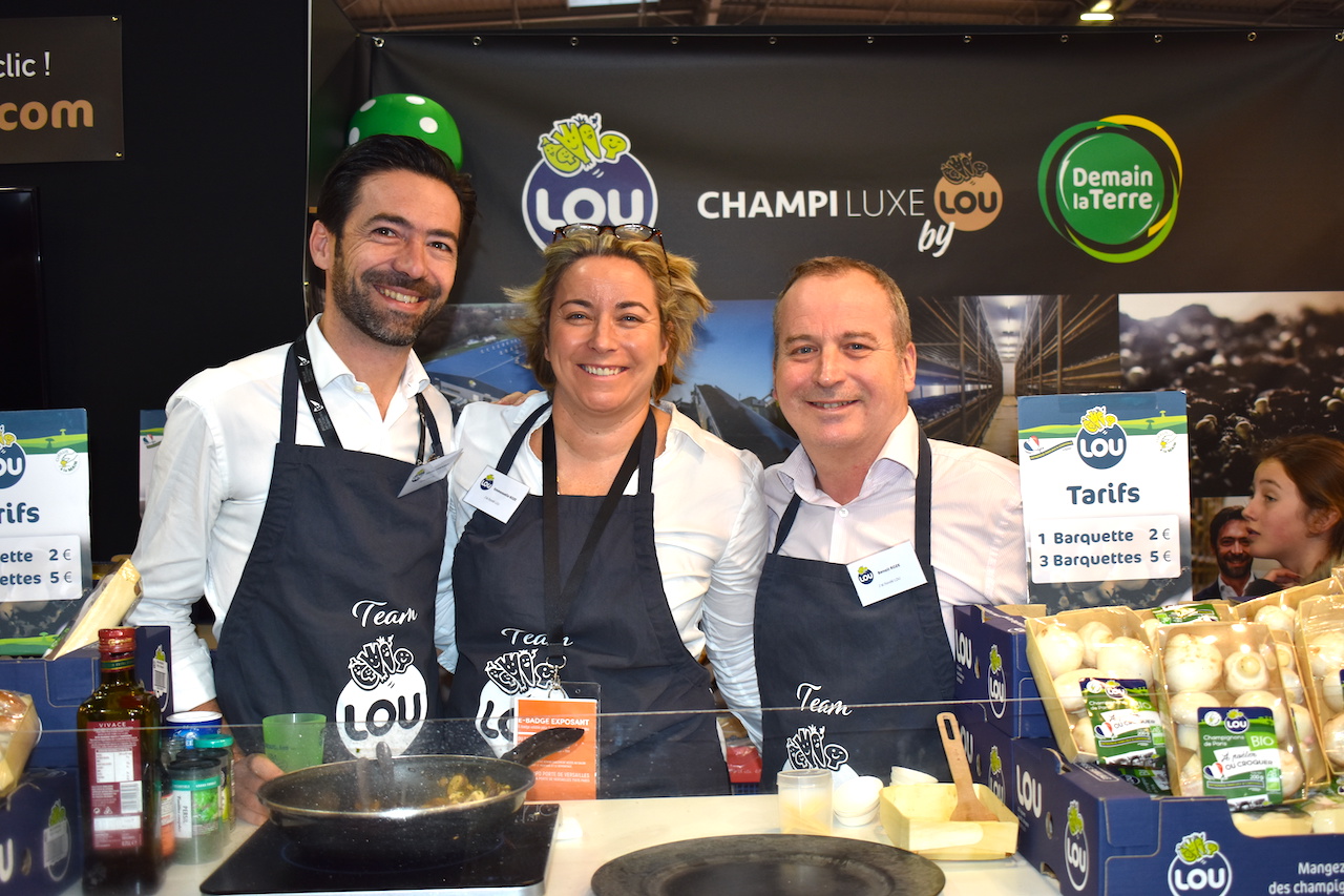 L'équipe des Champignons Lou avec Fabrice Chapuzet, Emmanuelle Roze-Chapuzet et Benoît Roze. Ils étaient présents au SIA pour faire goûter leurs champignons. L'entreprise produit 4500 tonnes de champignons chaque année.
