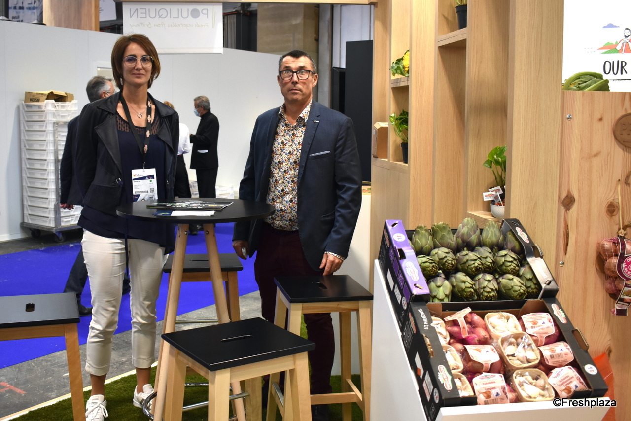 Stéphanie Della Schiava et Pascal Jaouen de la société Pouliquen, sur le stand de Prince de Bretagne. L'artichaut petit violet est le produit phare du moment !