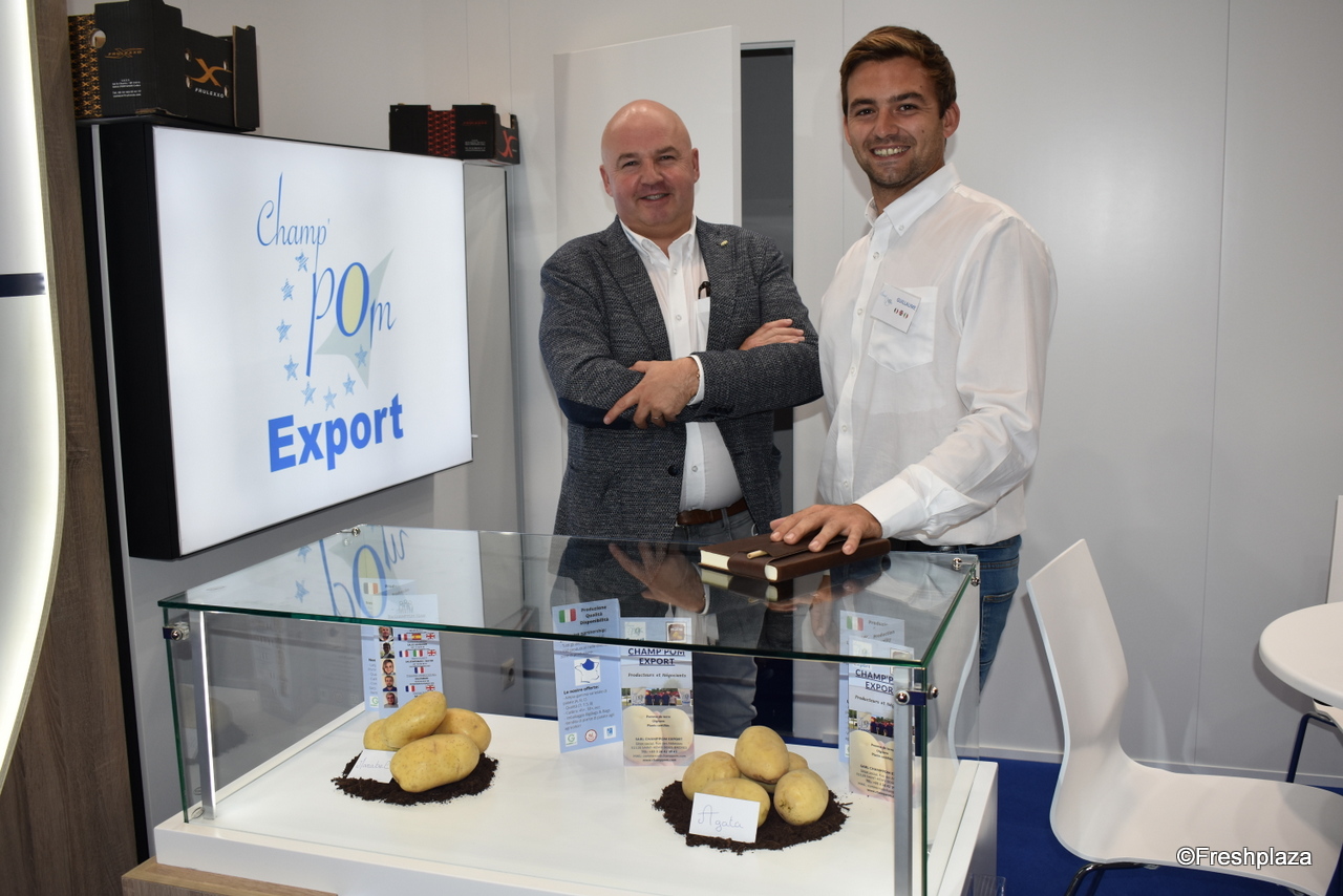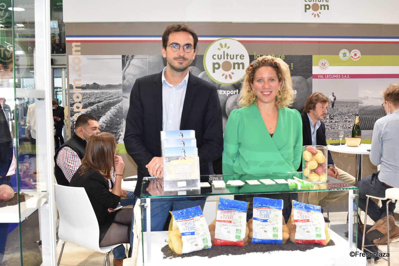 Olivier Delaitre et Guillaume Liesch sont venus représenter la société Champ'Pom au salon Fruit Attraction 2021. Ils se lancent désormais dans le conditionnement en sacs de 2,5 kg / 5 kg de pommes de terre françaises et de patates douces pour de la vente directe en supermarché.