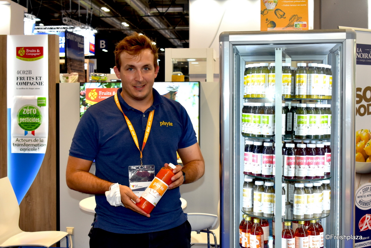 Edouard Gassier, co-fondateur de Phyte, sur le stand Fruits&Compagnie venu présenter sa gamme de boissons végétales composée de pressés végétaux, de laits végétaux et de kombuchas.