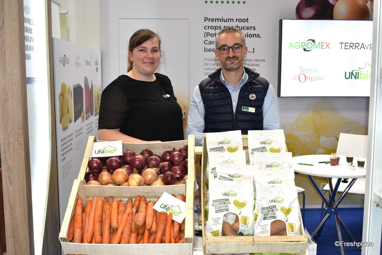 Clémence Cknockaert et Christophe Legrand derrière des produits certifiés Agriculture Biologique de la marque Unibio présentés par la Société Terraveg.