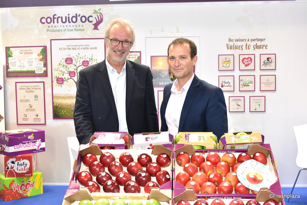 Didier Crabos et Philippe Jean de la société Cofruid'oc, mettent en avant leurs pommes de la marque Legend qu'ils commercialisent depuis 4 ans.