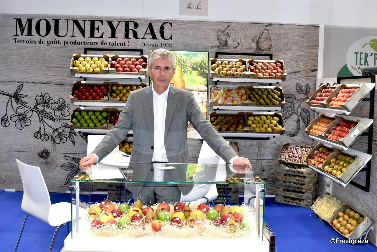 Serge Mouneyrac, venu rencontré ses clients au salon et présenter l'ensemble de la gamme de pommes et poires commercialisées sous la marque Mouneyrac.