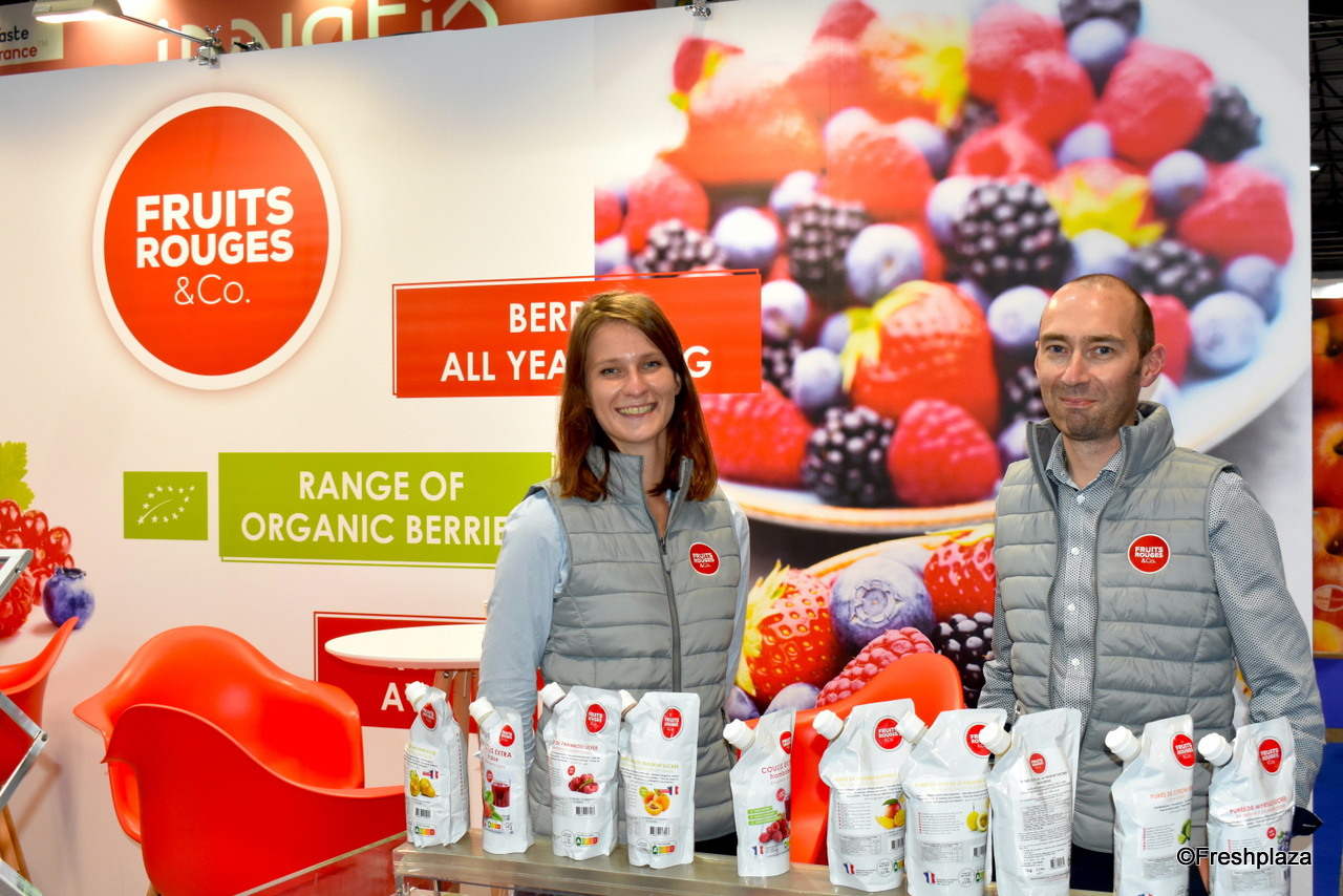 Camille Garnier et Jean-Charles Beguin, sur le stand de Fruits Rouges&Co, ont mis en avant la gamme de fruits rouges frais ainsi que la celle des produits transformés.