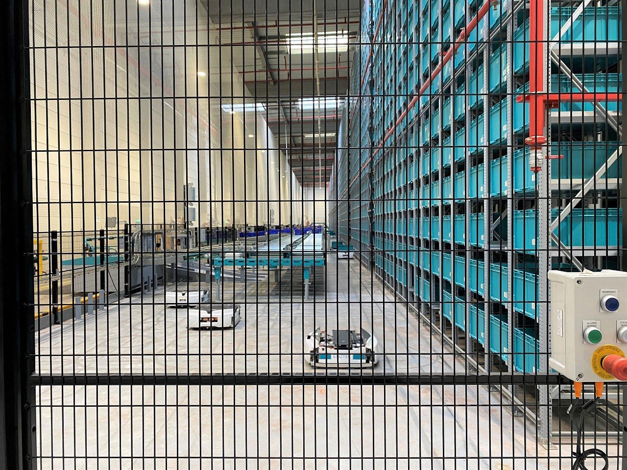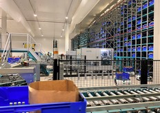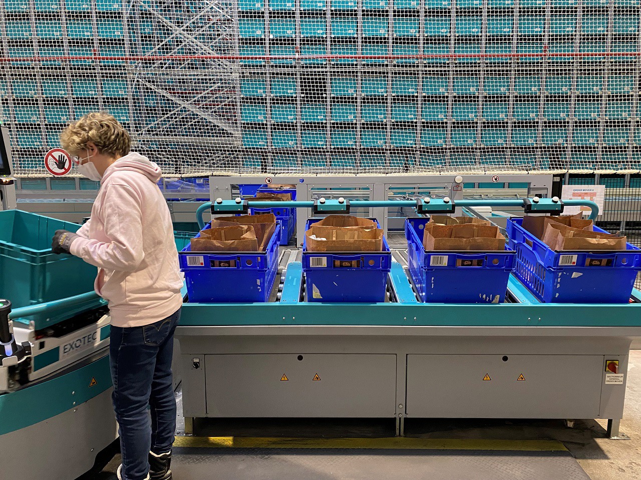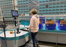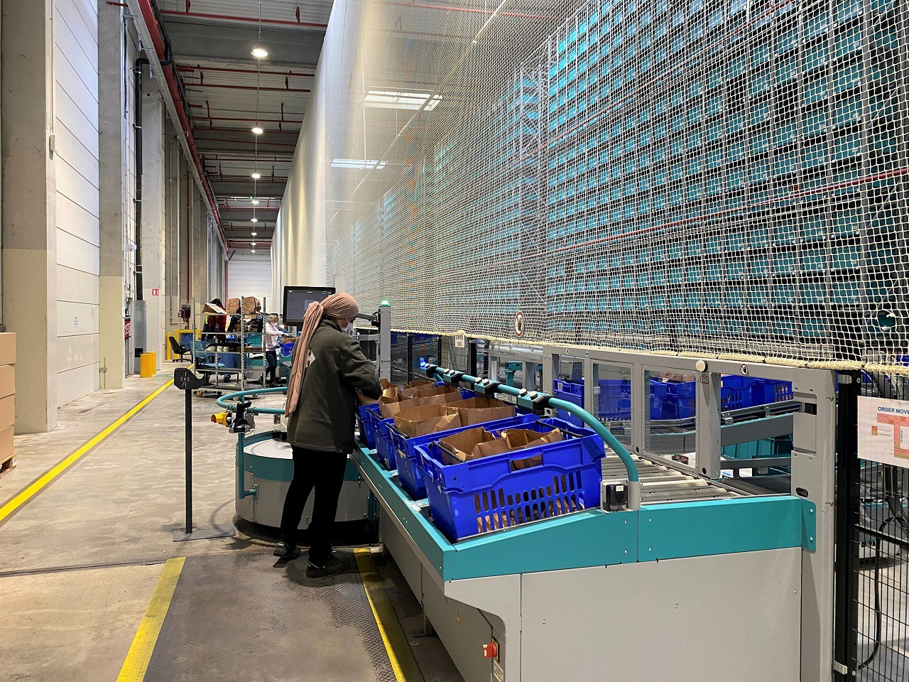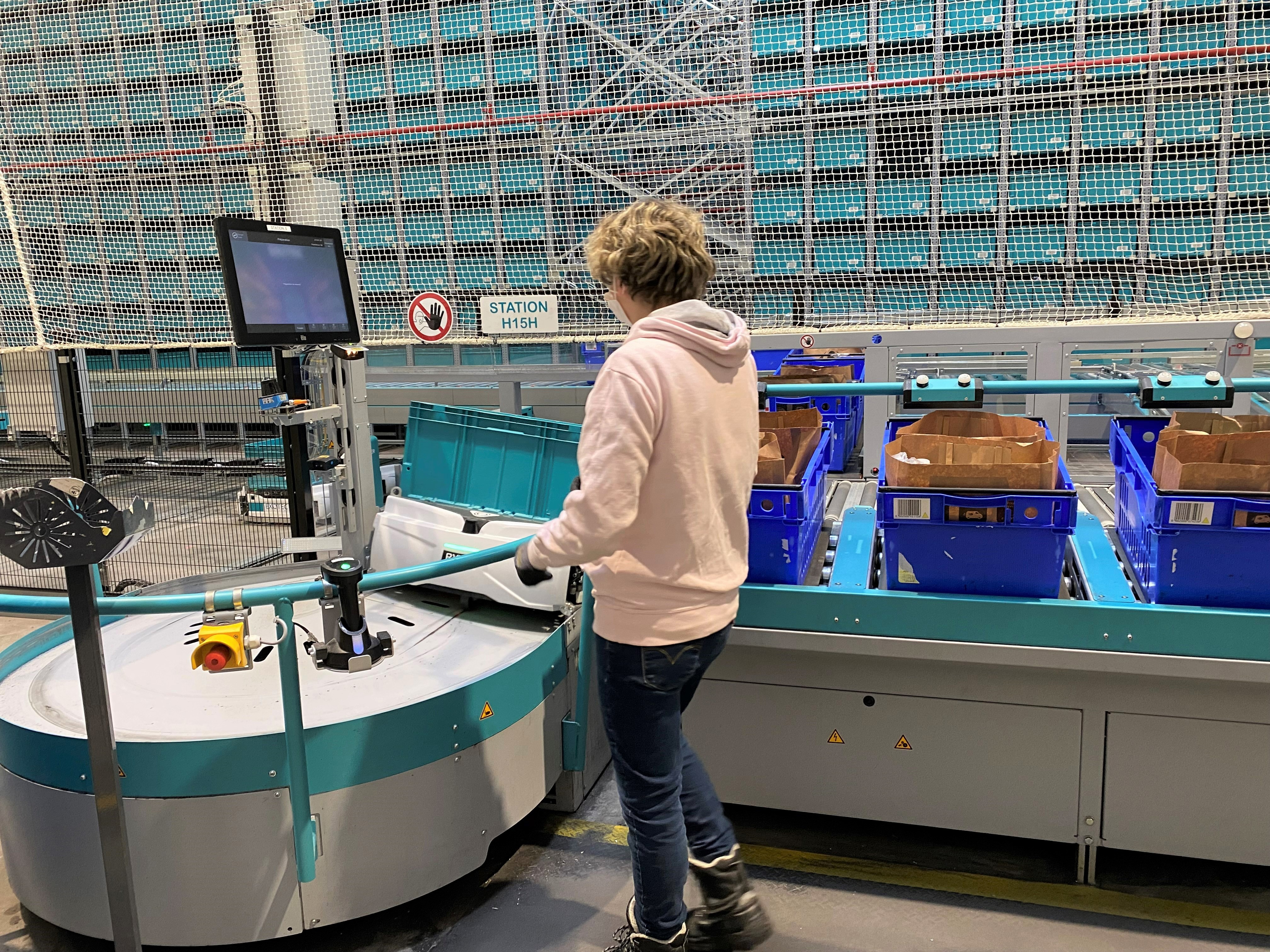 Espace produits secs comportant huit postes de préparation. L'opératrice récupère les produits acheminés par les robots pour les placer dans les bacs bleus.