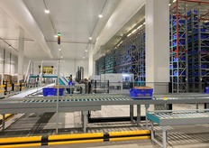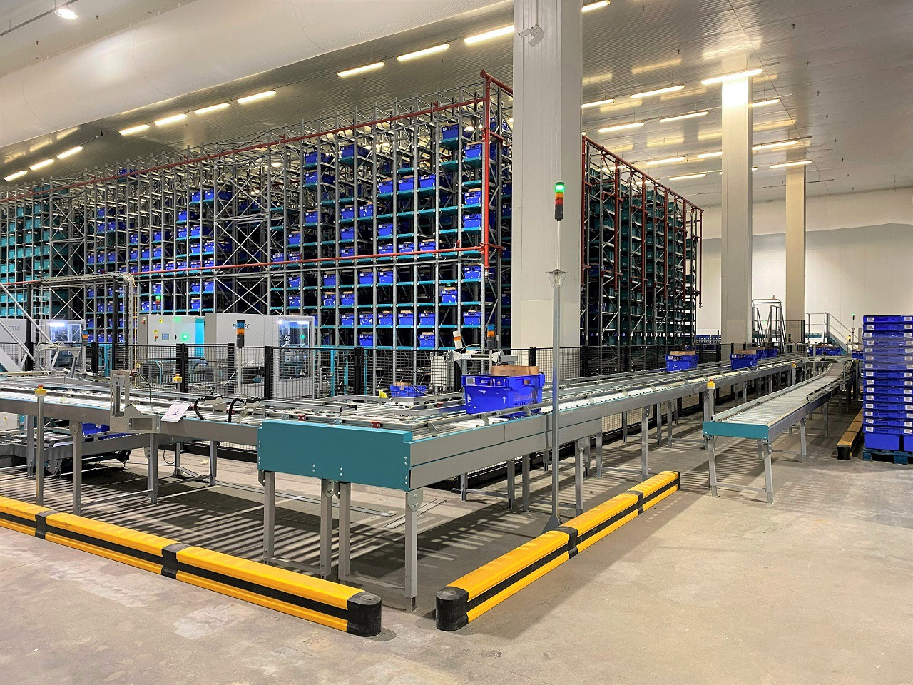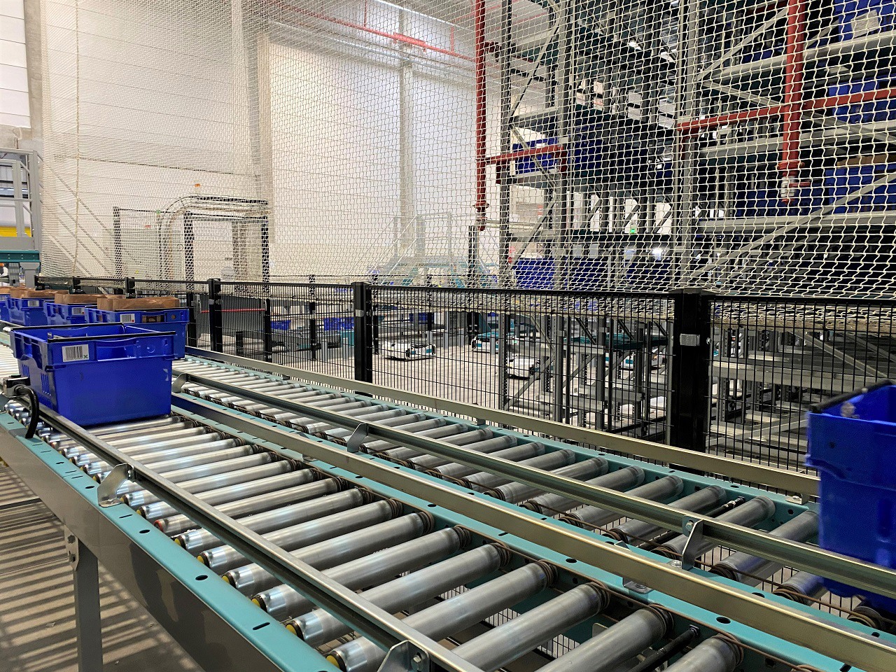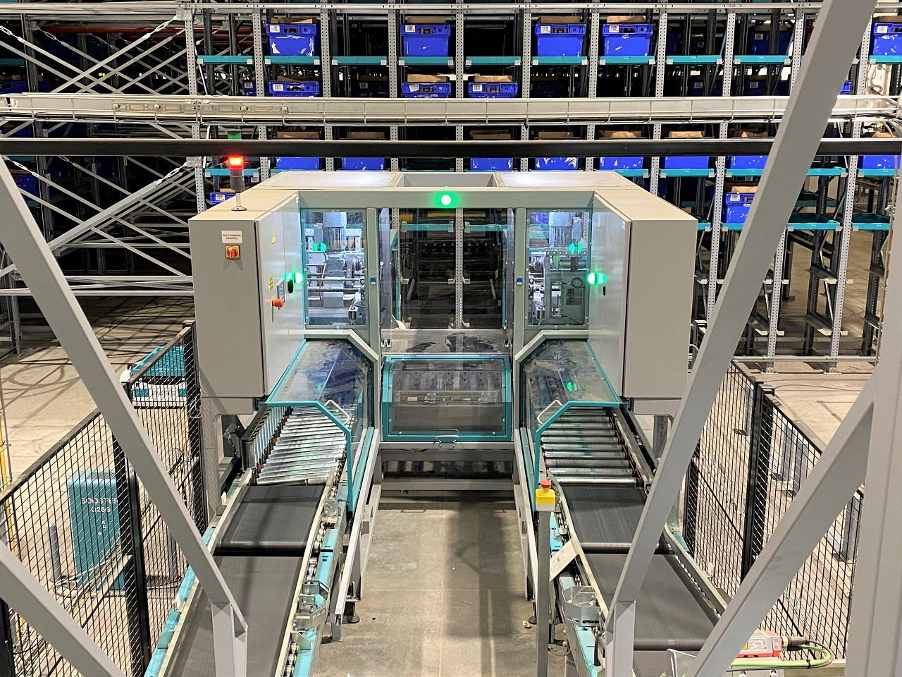 Espace produits secs comportant huit postes de préparation. L'opératrice récupère les produits acheminés par les robots pour les placer dans les bacs bleus.