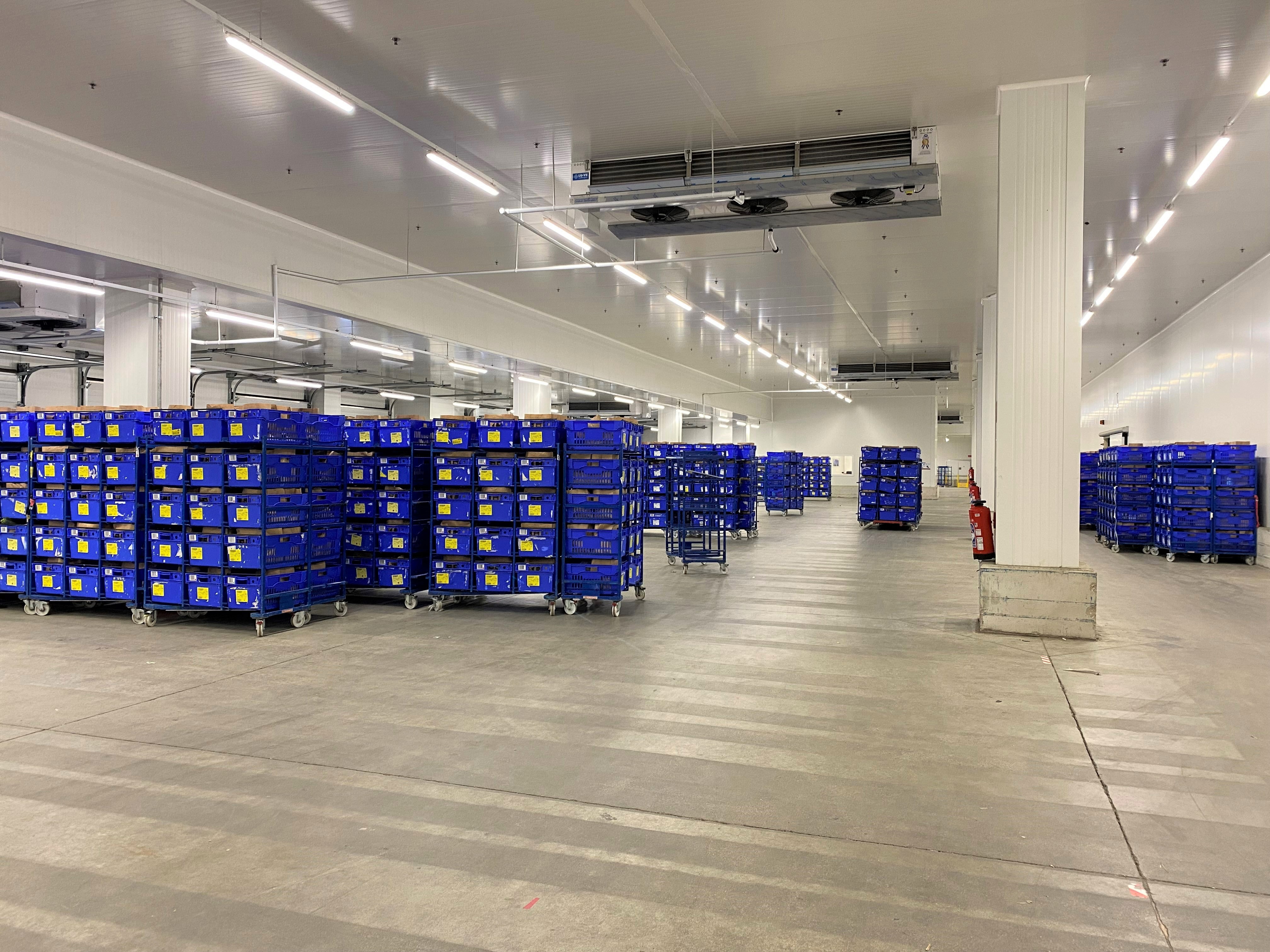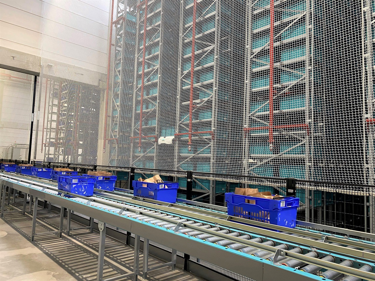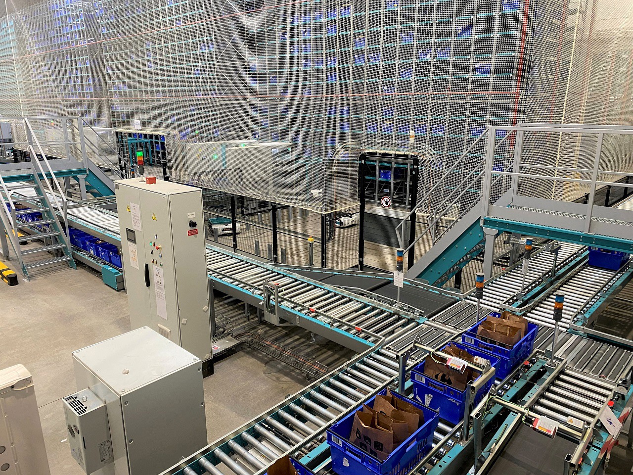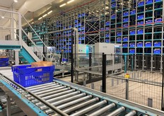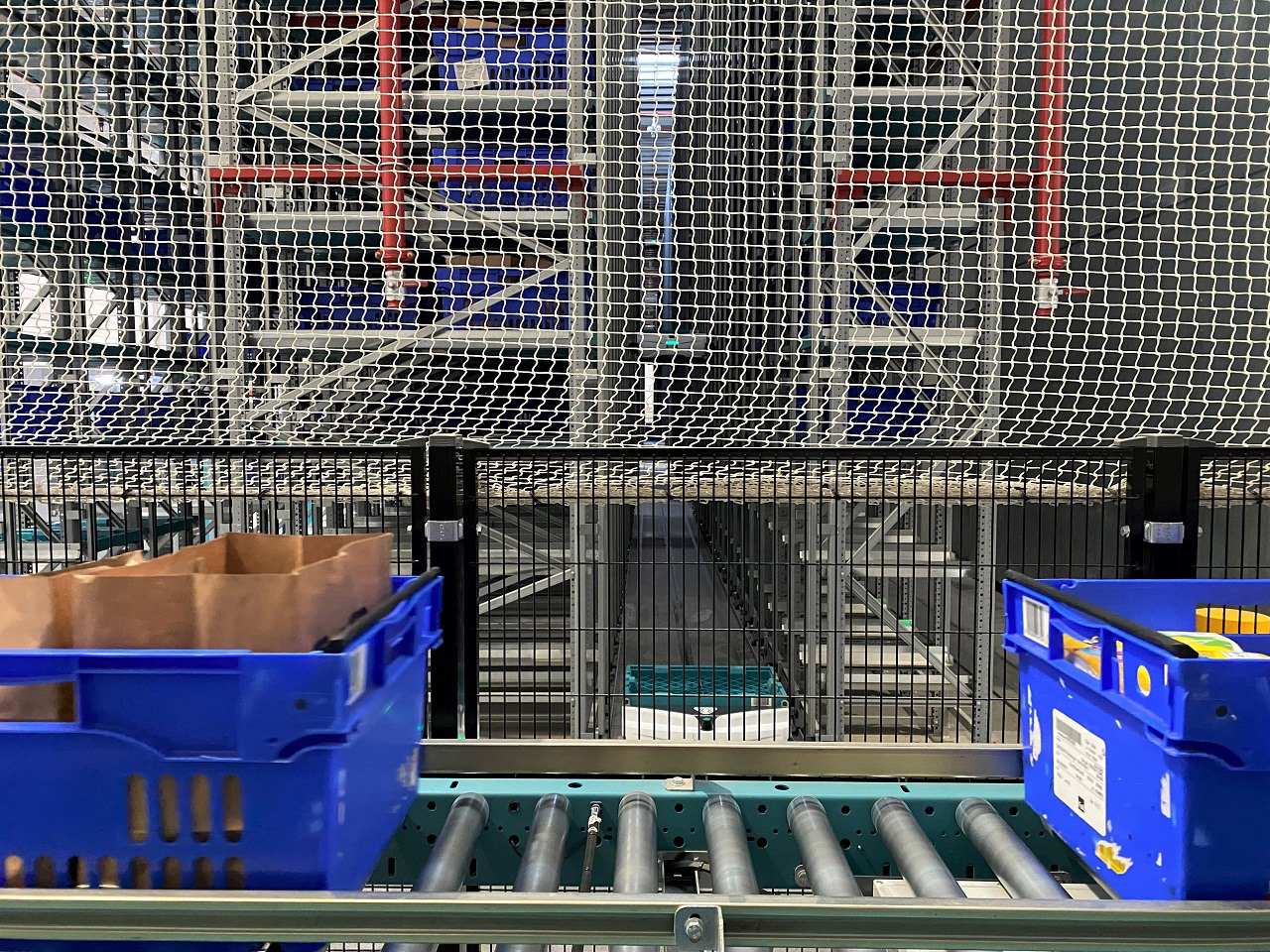 Espace produits secs comportant huit postes de préparation. L'opératrice récupère les produits acheminés par les robots pour les placer dans les bacs bleus.