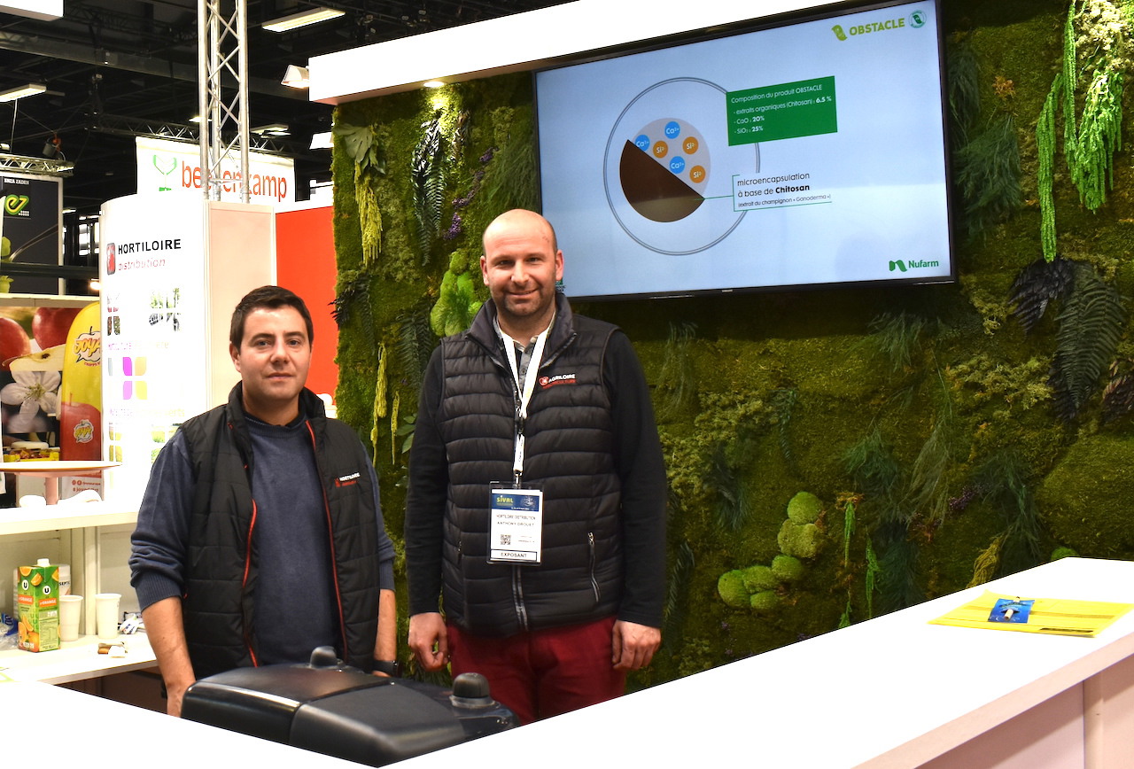 Sur le stand Planasa, William Jaguelin, commercial et Amaël Lagarde, développeur variétal sont venus présenter une nouvelle variété de fraise.