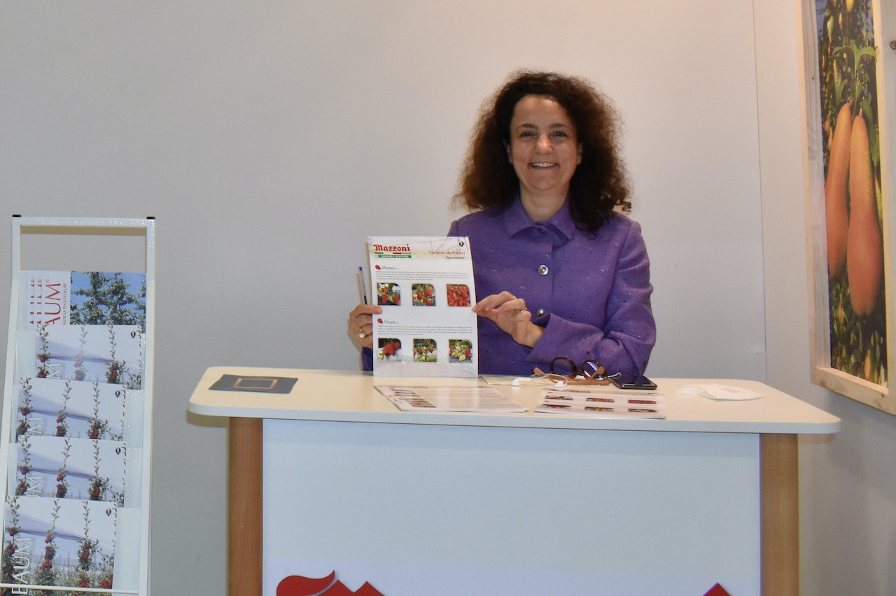Stand de Vivai Mazzoni avec Antonella Colacrai venue présenter trois nouvelles variétés de fraise : Edwina, Klodia et Giusy.