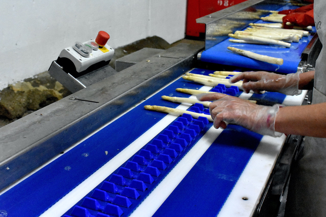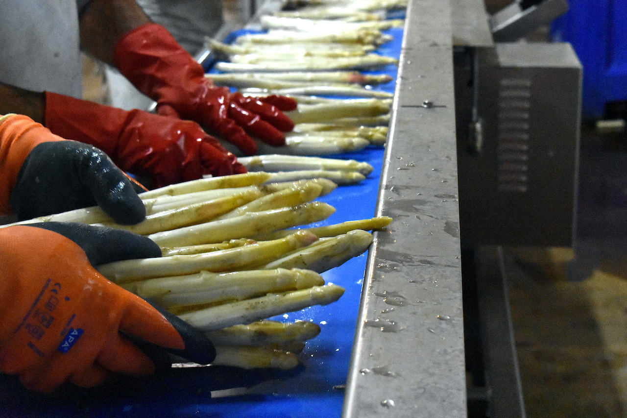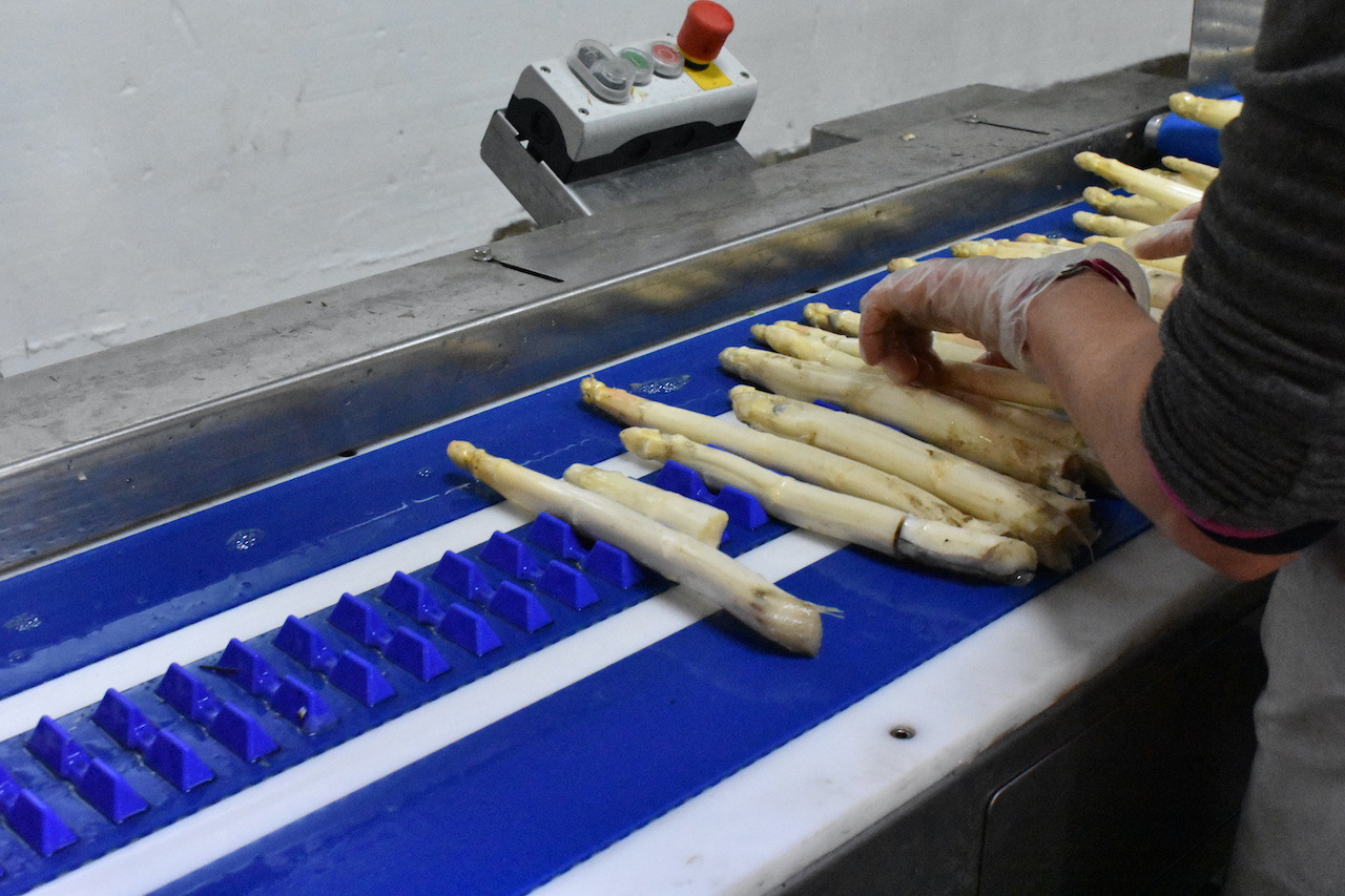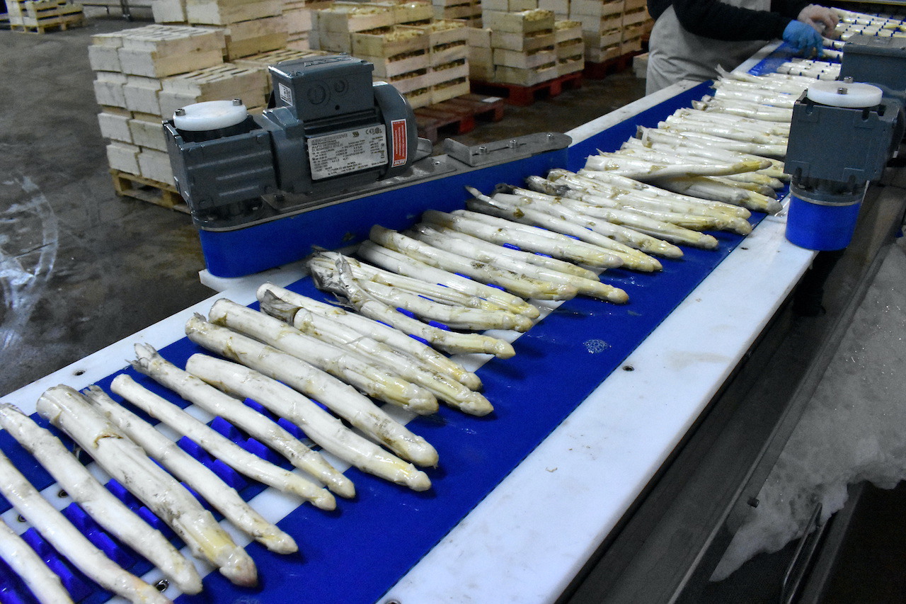 Le conditionnement commence. Les asperges sont disposées sur le tapis convoyeur