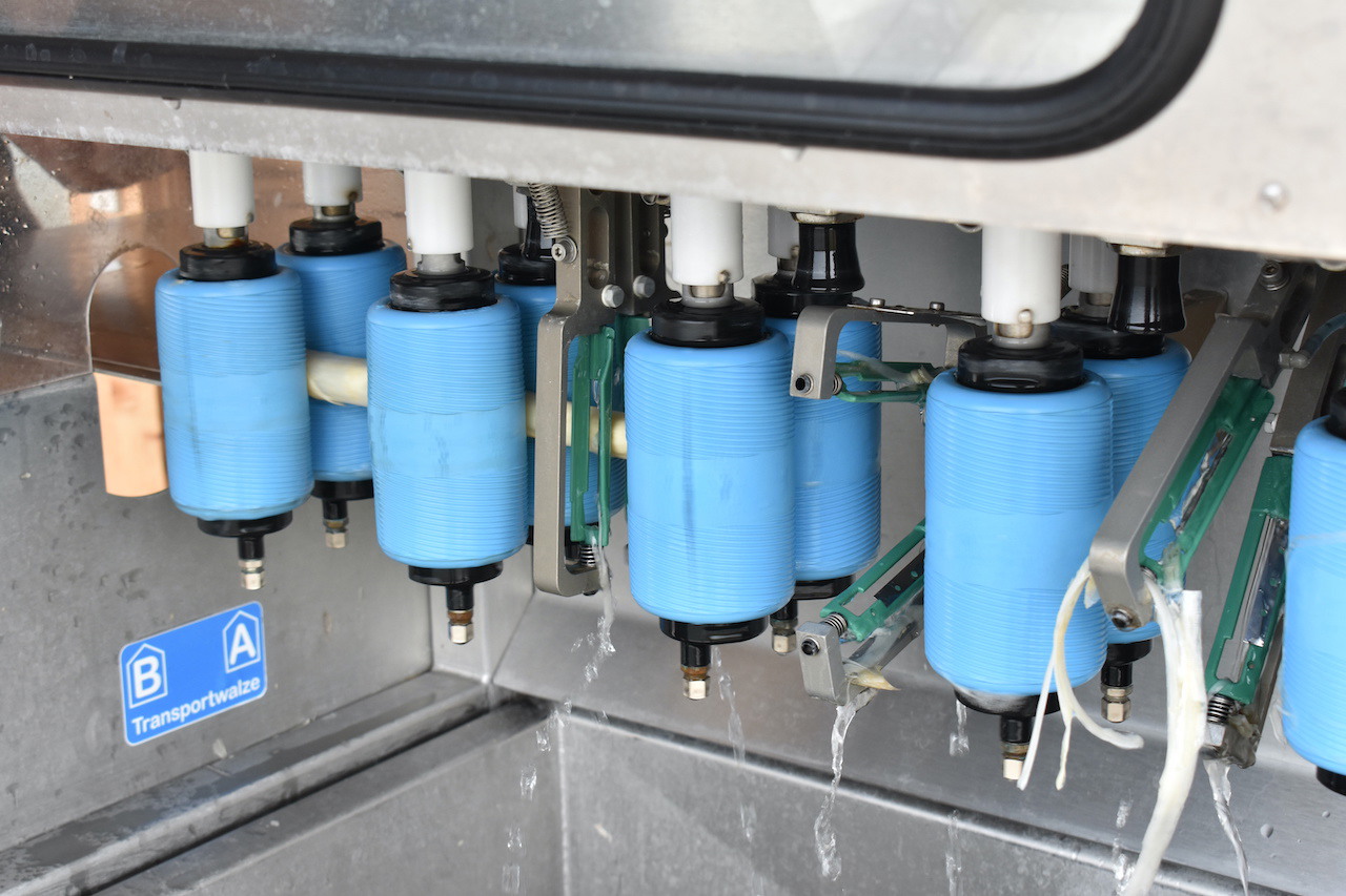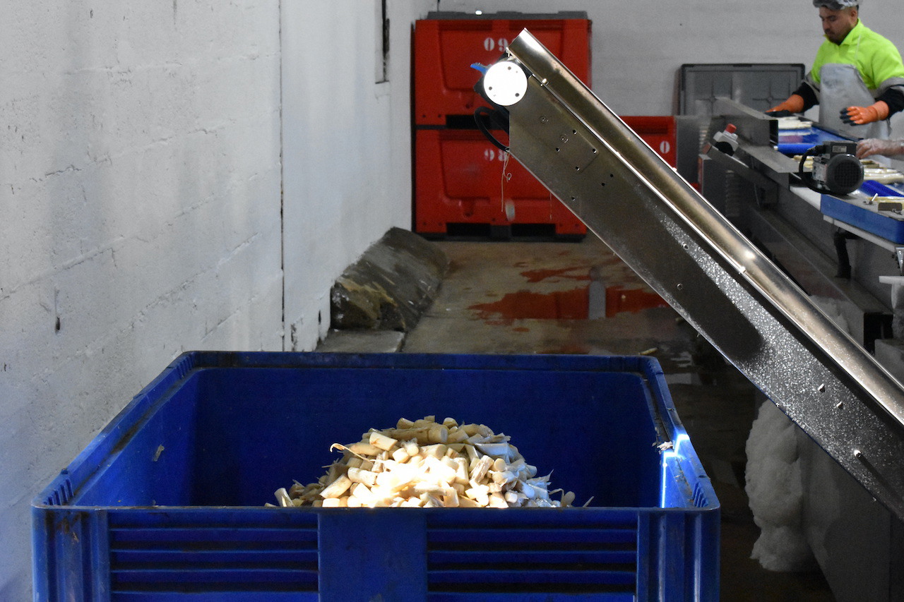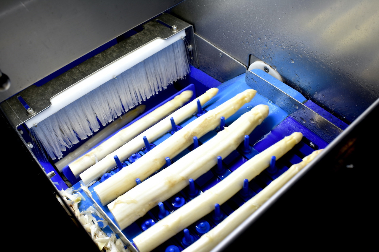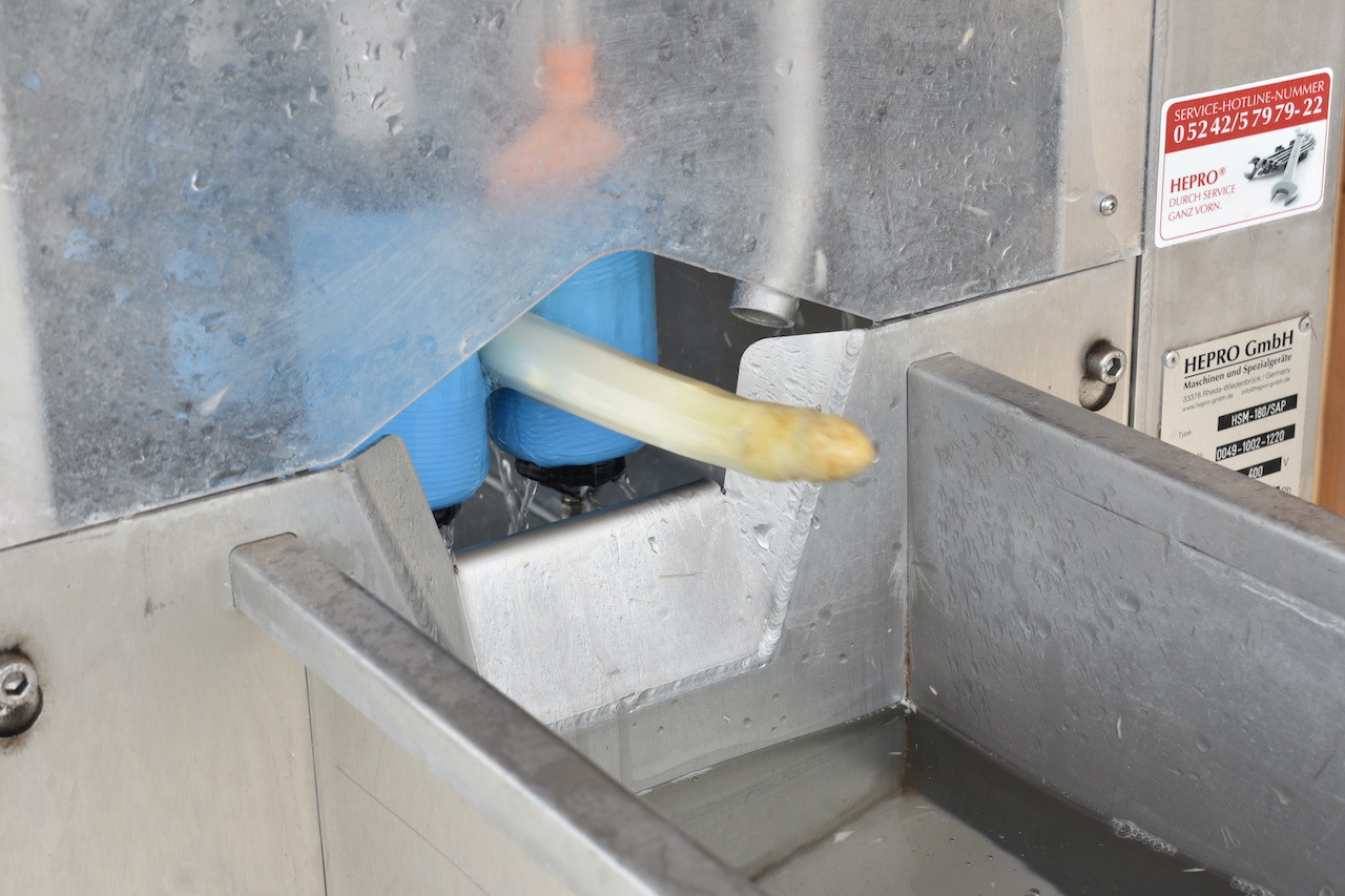 Ainsi, quelques secondes plus tard seulement, l'asperge ressort de la machine et est propulsée dans un canal d'eau claire, prête à être récupérée