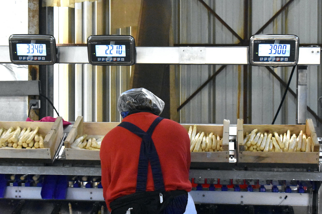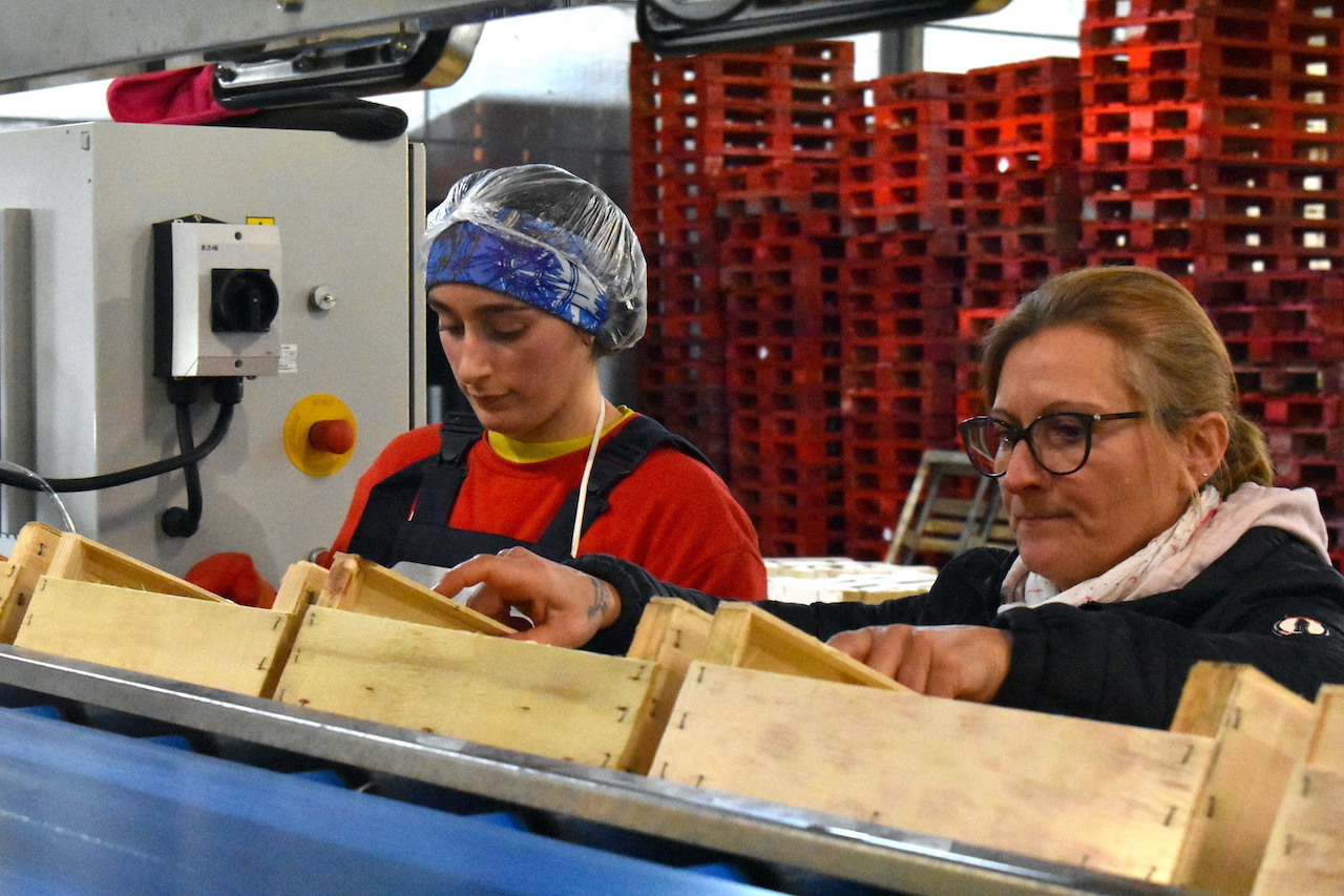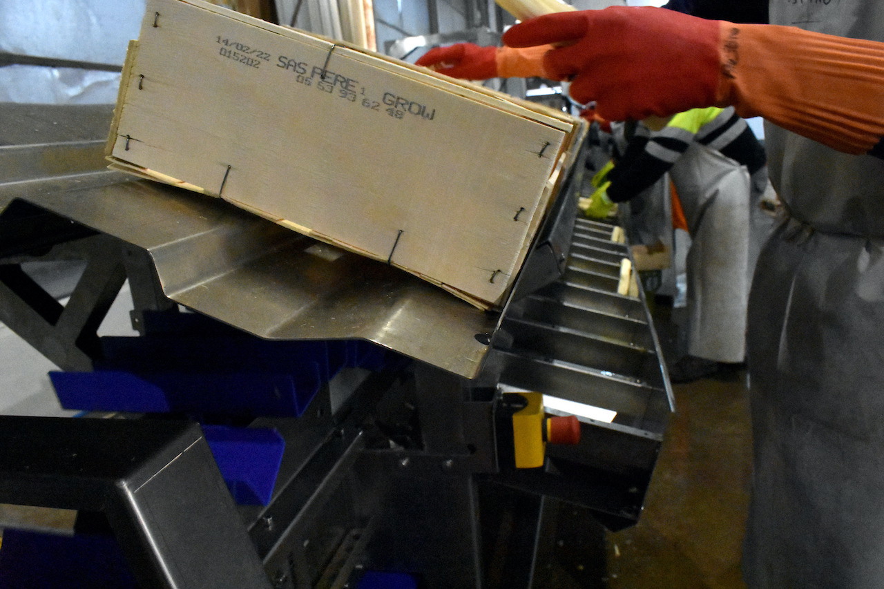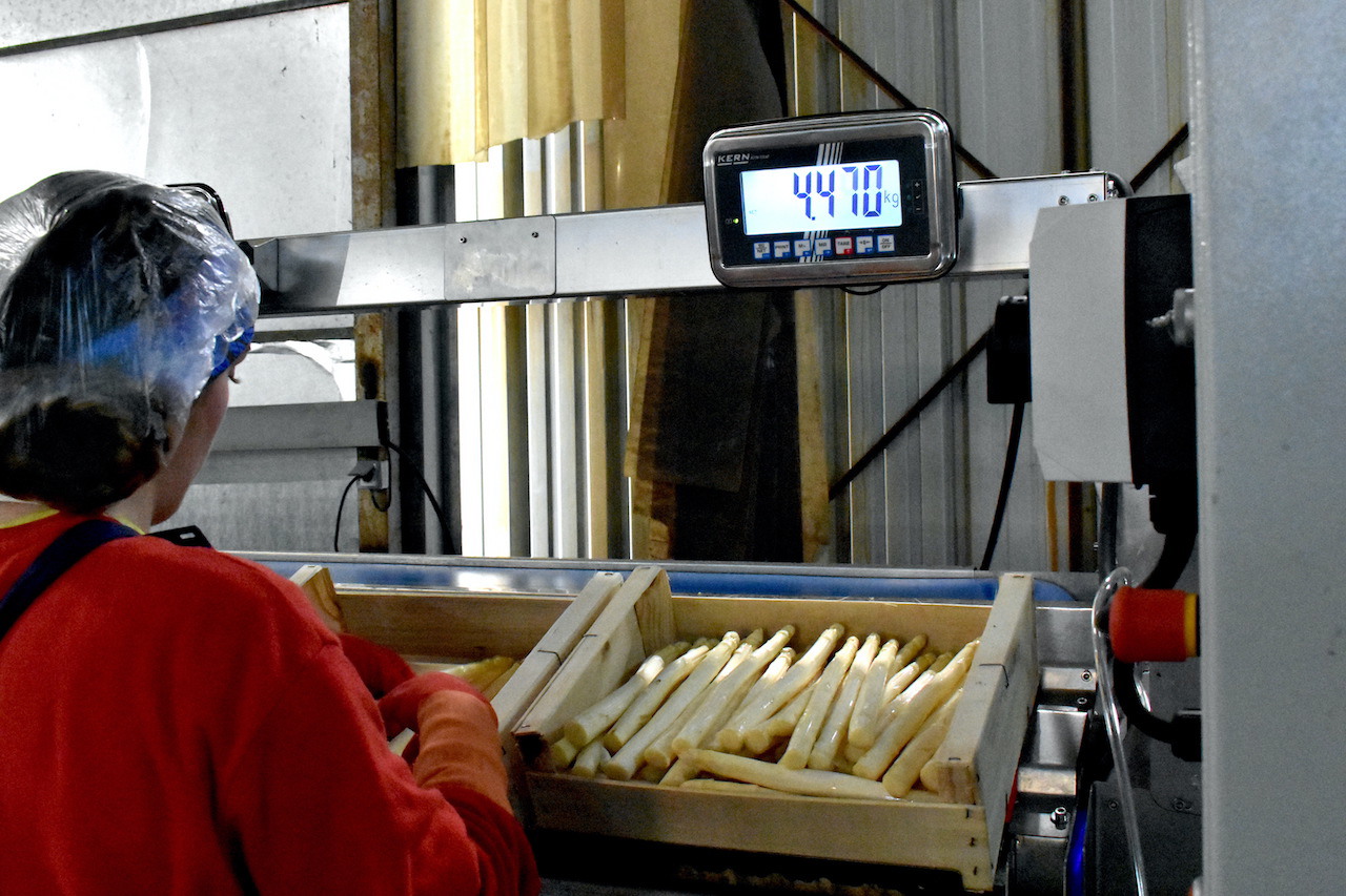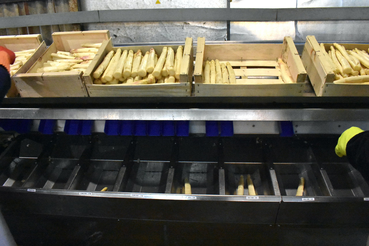 Une fois coupées, les asperges tombent dans des godets en fonction de leur calibre où elles sont récupérées et disposées directement dans des caisses en bois. Une fois que les 5 kilos sont atteints, la caisse pleine est remplacée par une autre vide