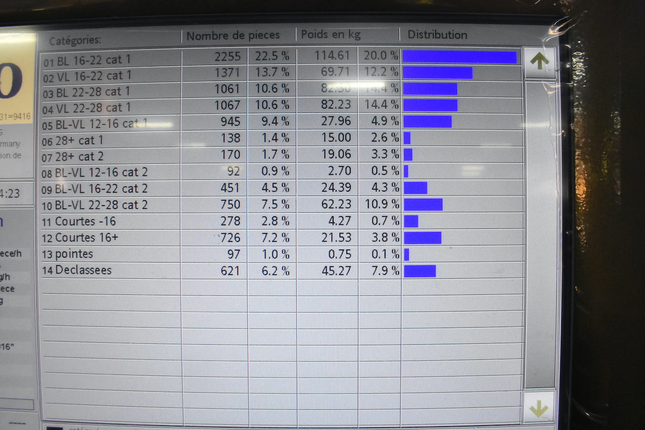 L'écran central rend compte de la répartition des calibres et catégories. On constate qu'il y a une majorité de calibres de première catégorie, qu'il s'agisse des asperge blanches ou vertes
