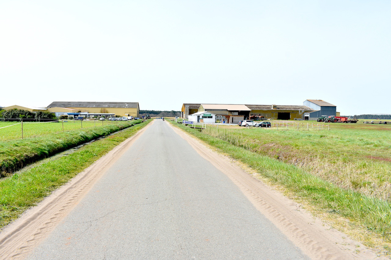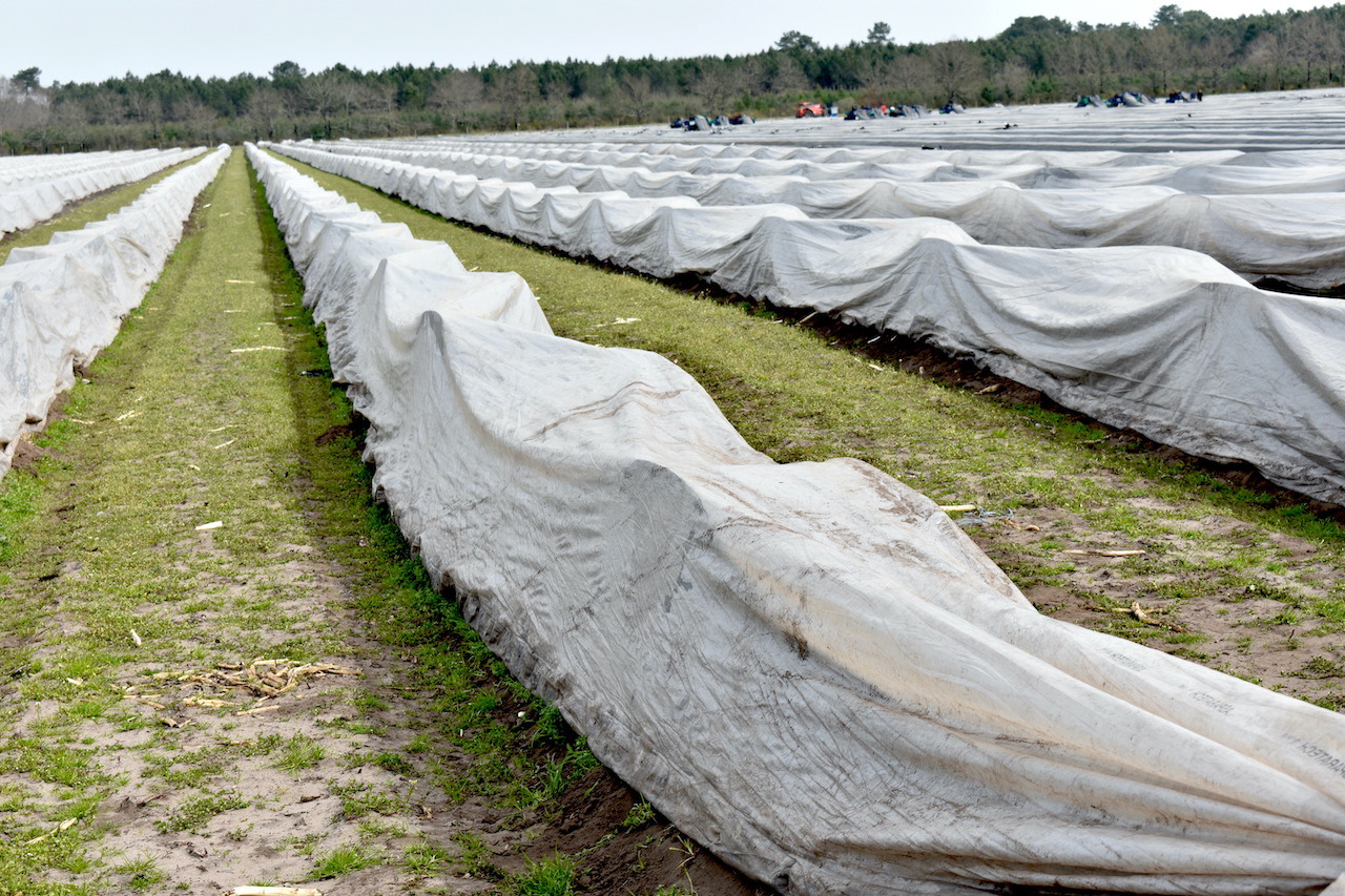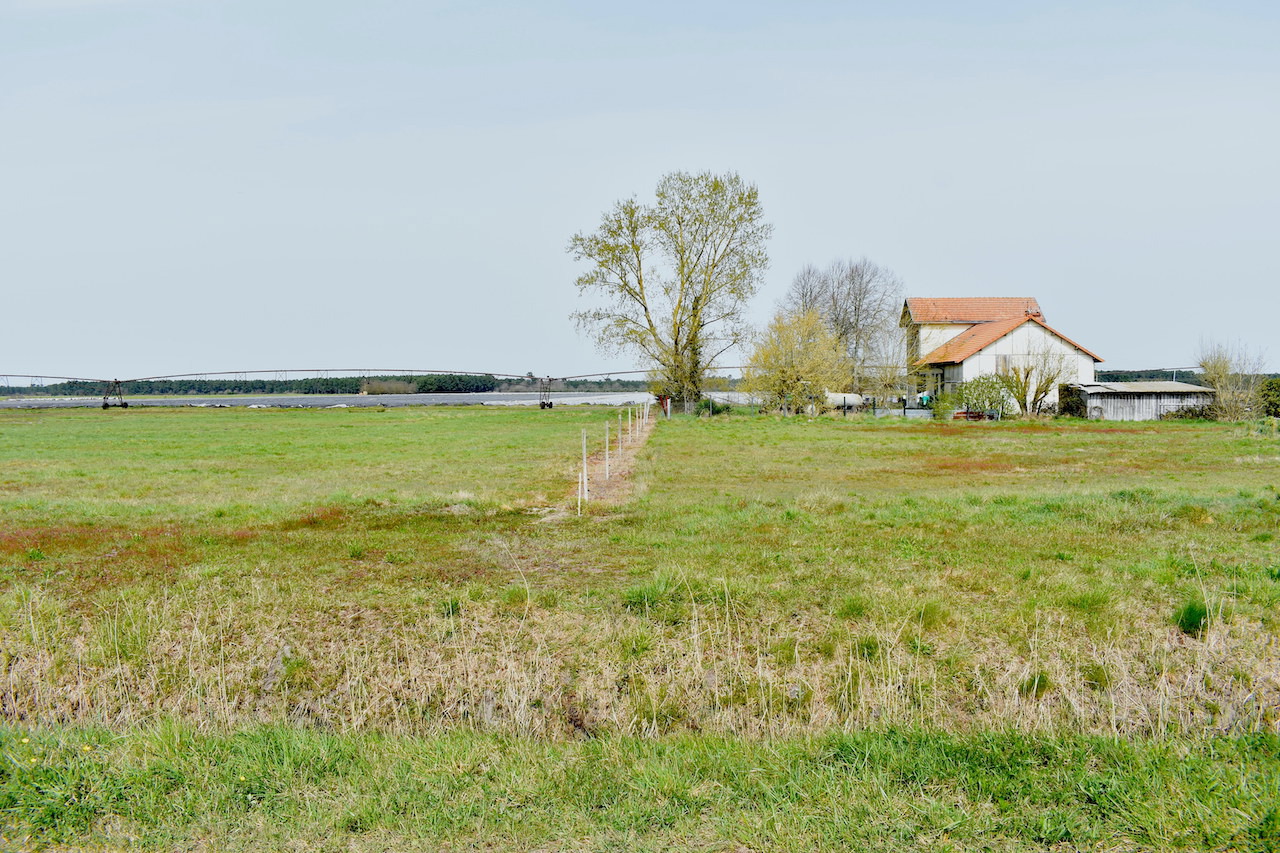 Les champs d'asperges en arrière-plan et la maison où sont logés les saisonniers