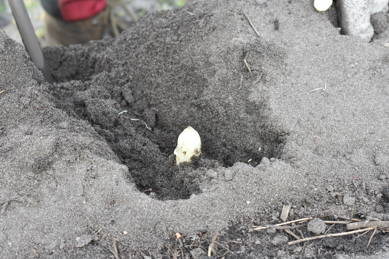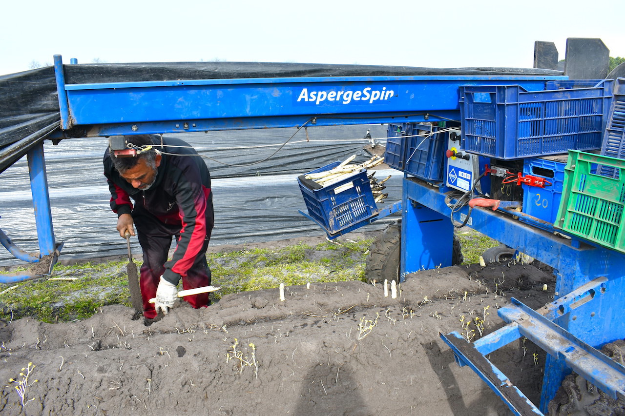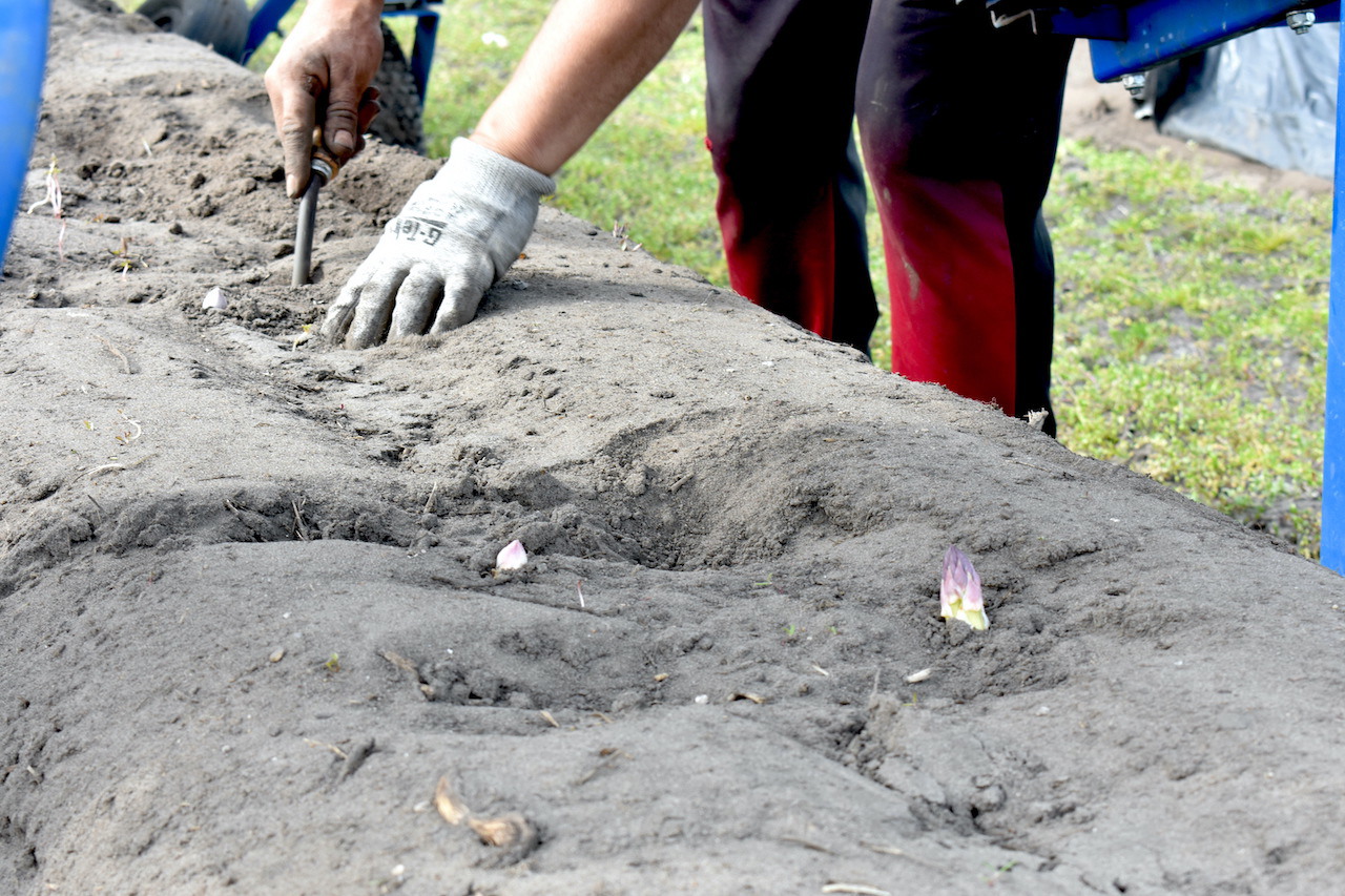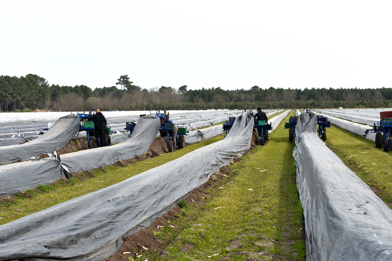 Certaines asperges n'étant pas sorties de la terre, l'expérience du cueilleur lui permet de déterrer celles qui se cachent sous terre mais qui sont prêtes à être récoltées