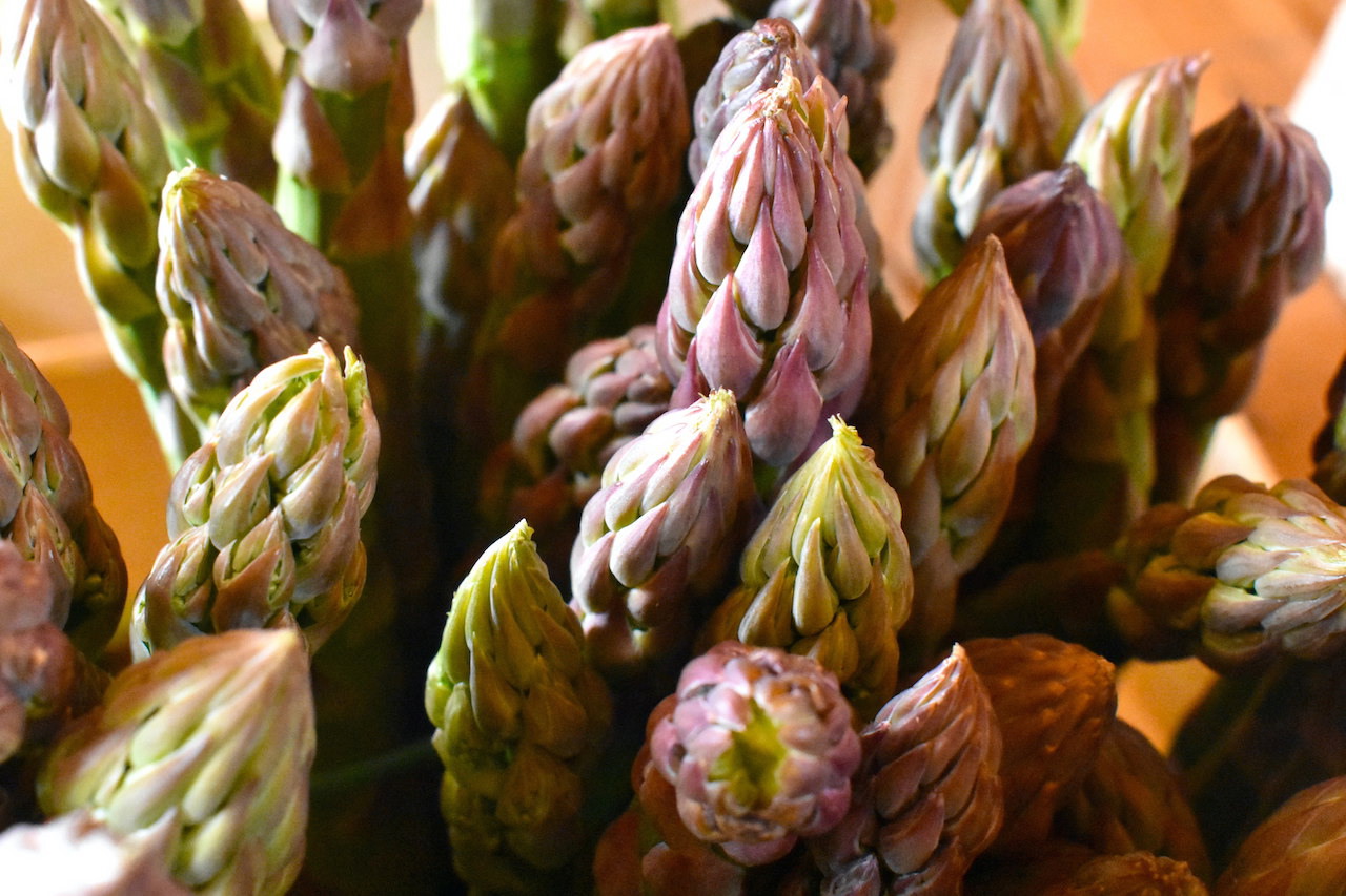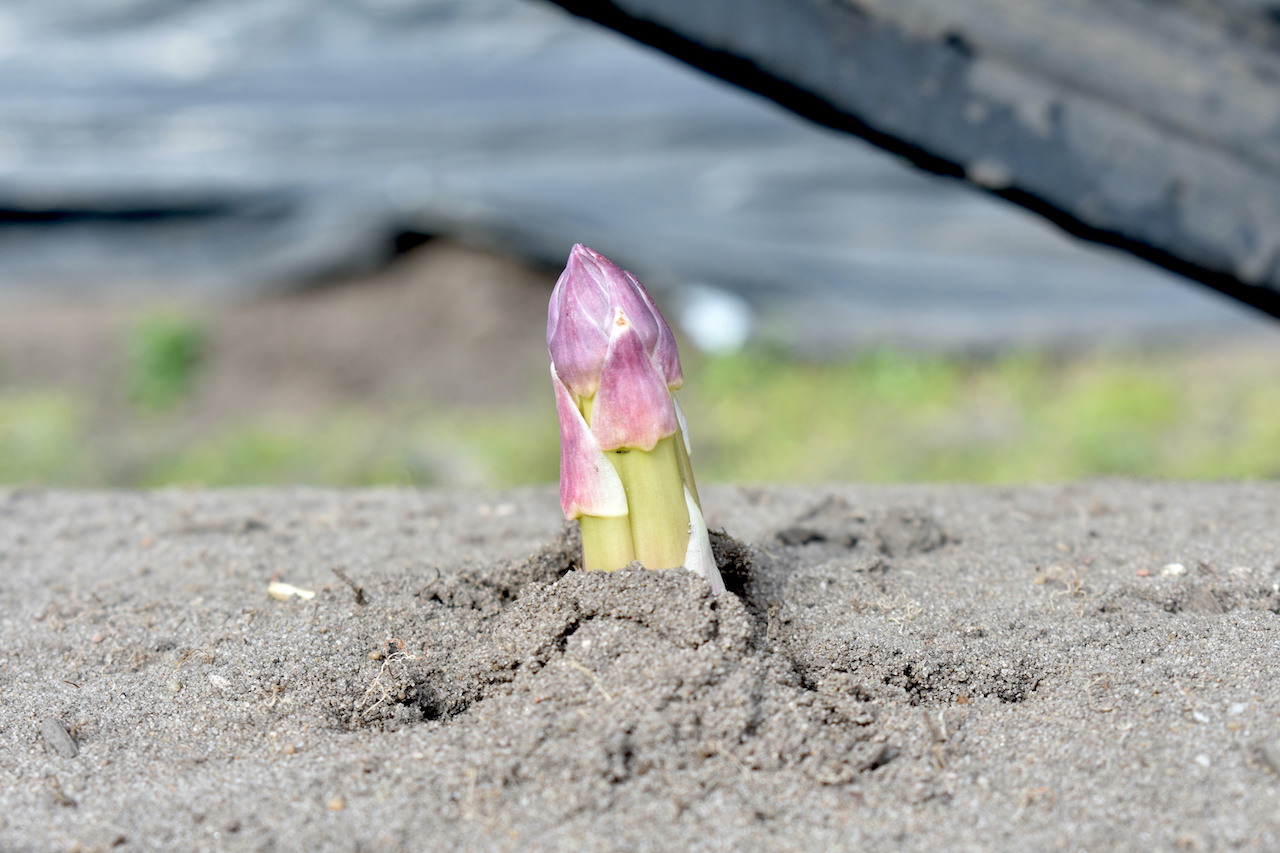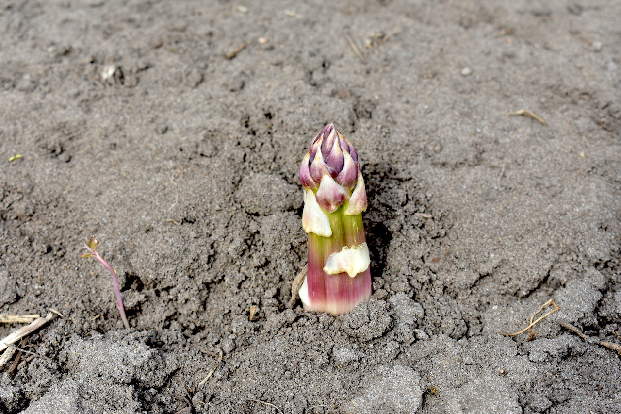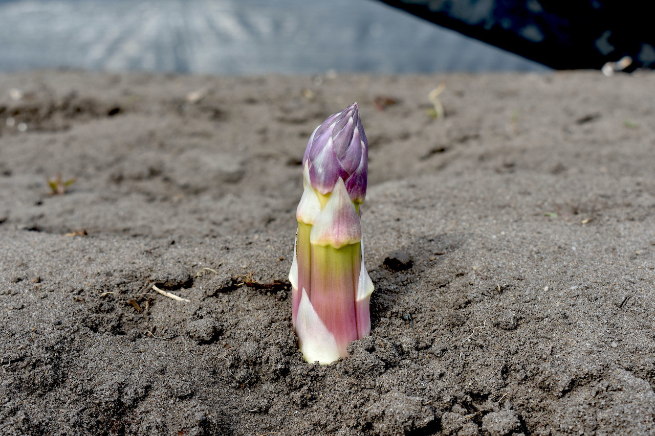 Lorsque la bâche en plastique est enlevée, la photosynthèse s'effectue, et l'asperge se pare d'un joli dégradé de violet vert