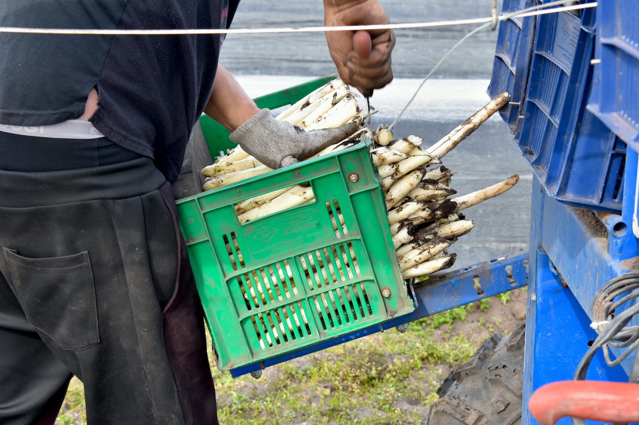 Les asperges déjà pré-sélectionnées par le cueilleur sont disposées pointes en bas contre de la mousse dans une caisse en plastique ajourée à l'arrière. Cela permet au cueilleur d'égaliser la taille des asperges à l'aide d'un couteau directement au champ