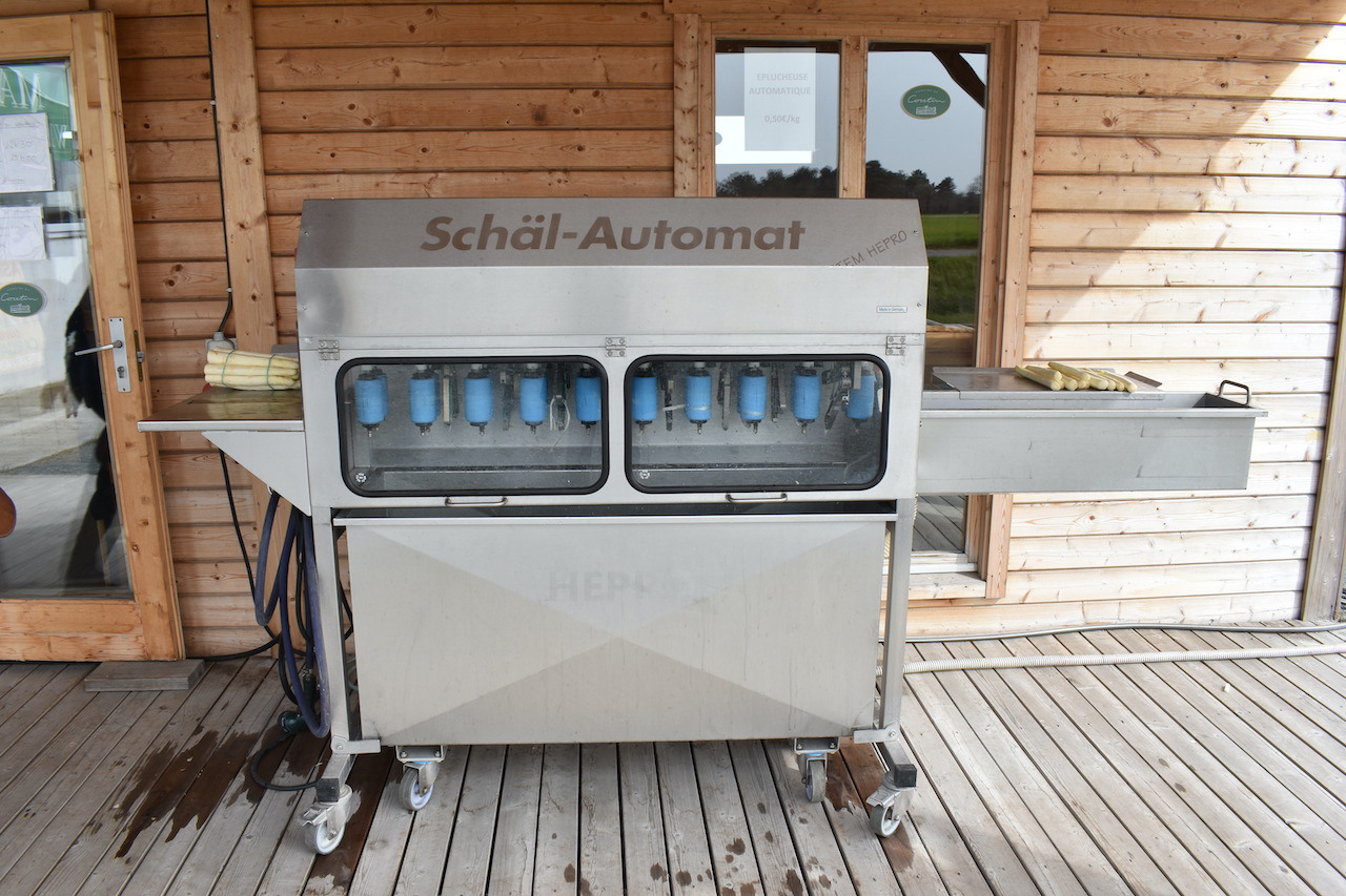 La peleuse d'asperges, une innovation que seules trois exploitations en Aquitaine détiennent. Pour ceux qui souhaitent économiser un temps précieux dans la préparation des asperges, le Domaine de Coutin a investi pour que les clients puissent éplucher leurs asperges sur place. Un service vivement apprécié