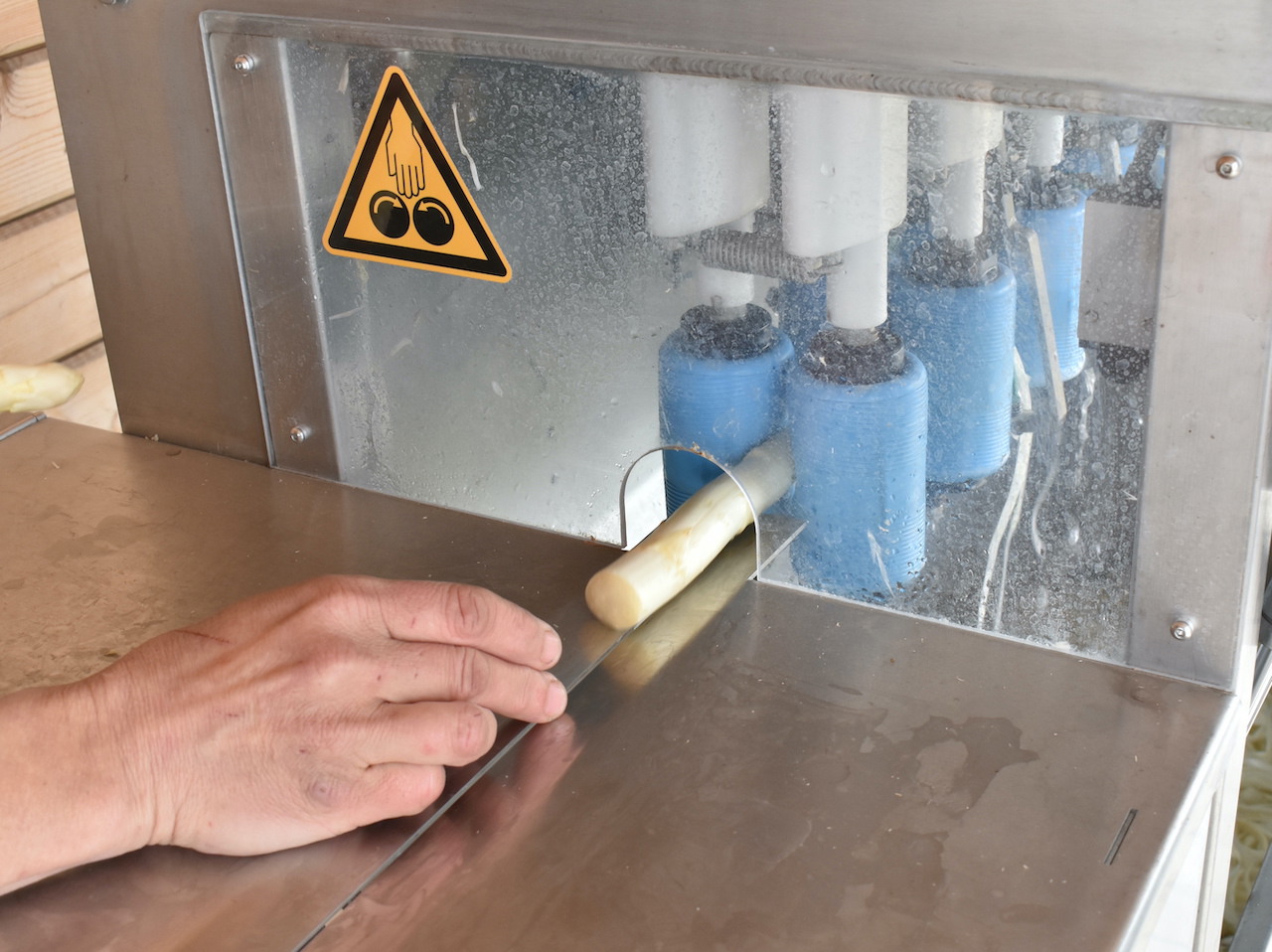Les asperges passent une à une entre des cylindres de mousse et une série d'économes différemment orientés